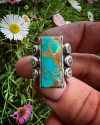 Hand wrought Heavy Ingot from repurposed early 1890s Sterling Silver, cold chiseled split skank, stamped, filed and crowned with a beautiful vibrant High Grade American Turquoise. Built to last generations!