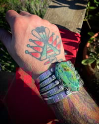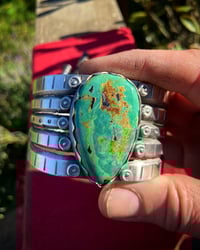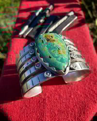 Handmade using traditional techniques with HEAVY Ingot forged from repurposed 1890s 925 Sterling Silver. Cold chiseled, filed & layered with large Peyote buttons. Crowned with an amazing Gem Grade Natural Royston Turquoise. Old Style classic and built to last generations