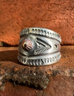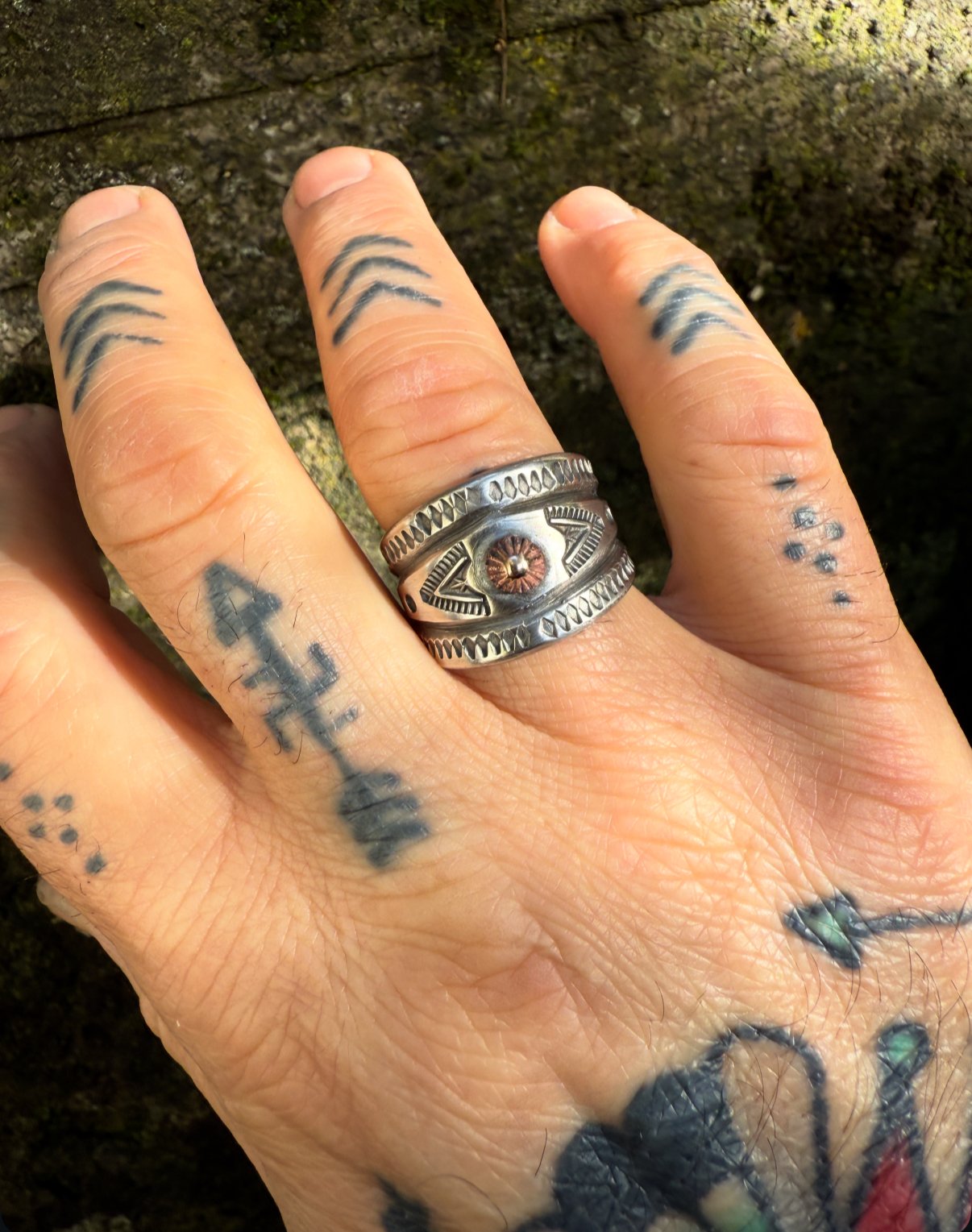 Hand wrought heavy Ingot (1/2 wide top & tampered back) from repurposed early 1890s Sterling Silver, cold chiseled, stamped, filed and crowned with an Ancient Bronze Peak. Built to last generations!