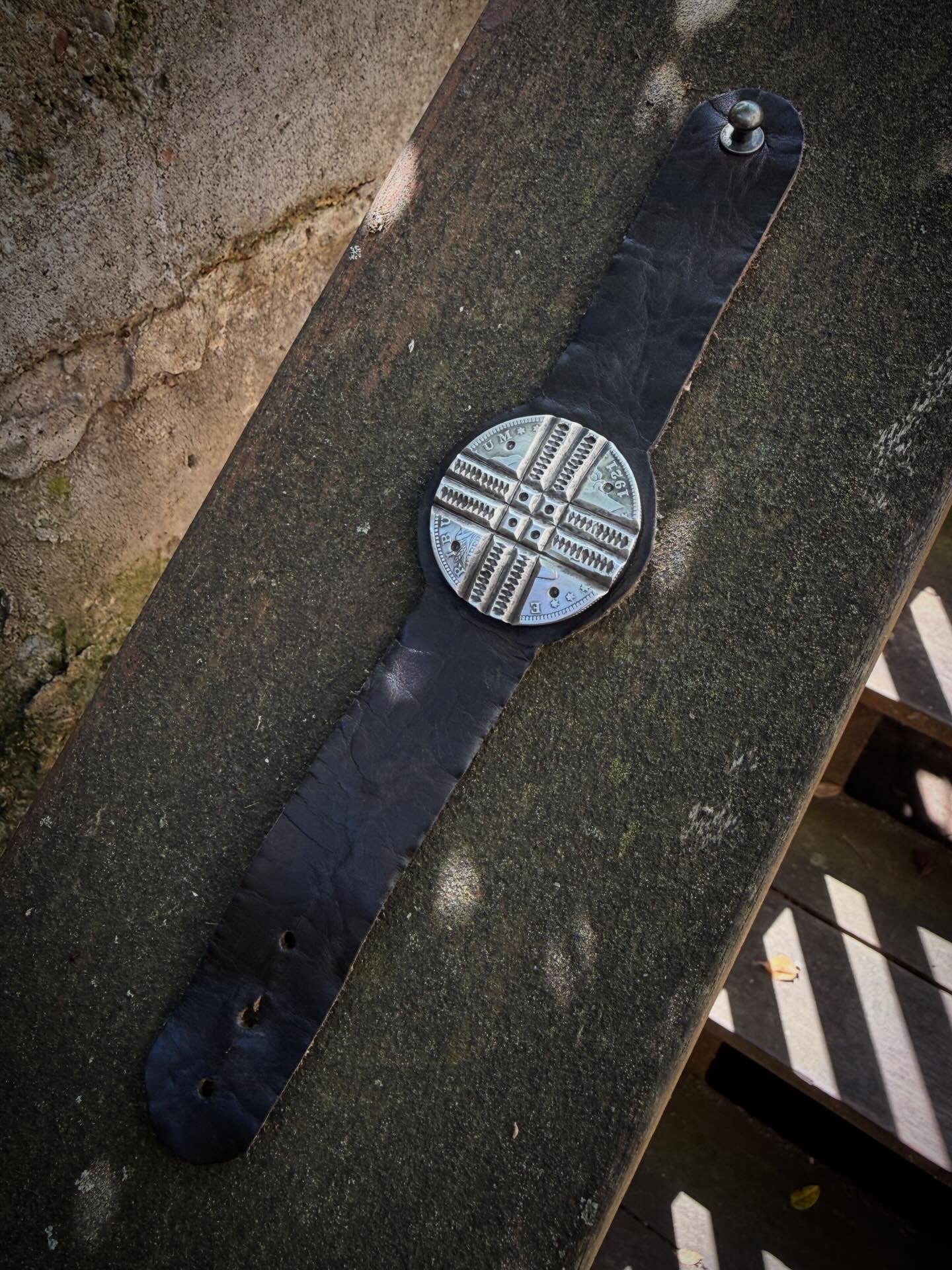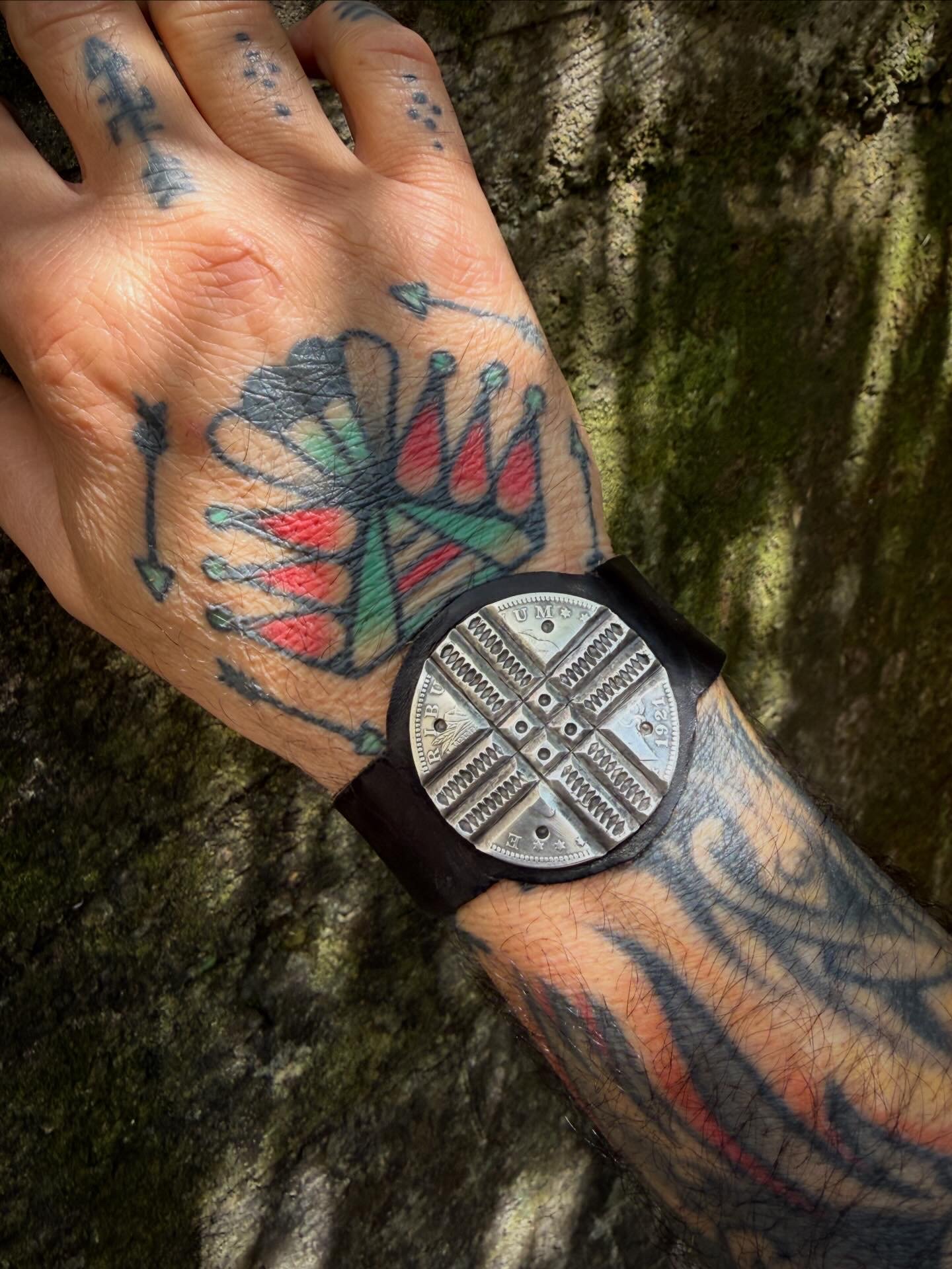 Crossroads Medicine Leather Bracelet Handmade with Morgan Silver Dollar (date code 1921) --- tooled, cold chiseled & stamped, set on vintage leather. Old Style classic and built to last generations.