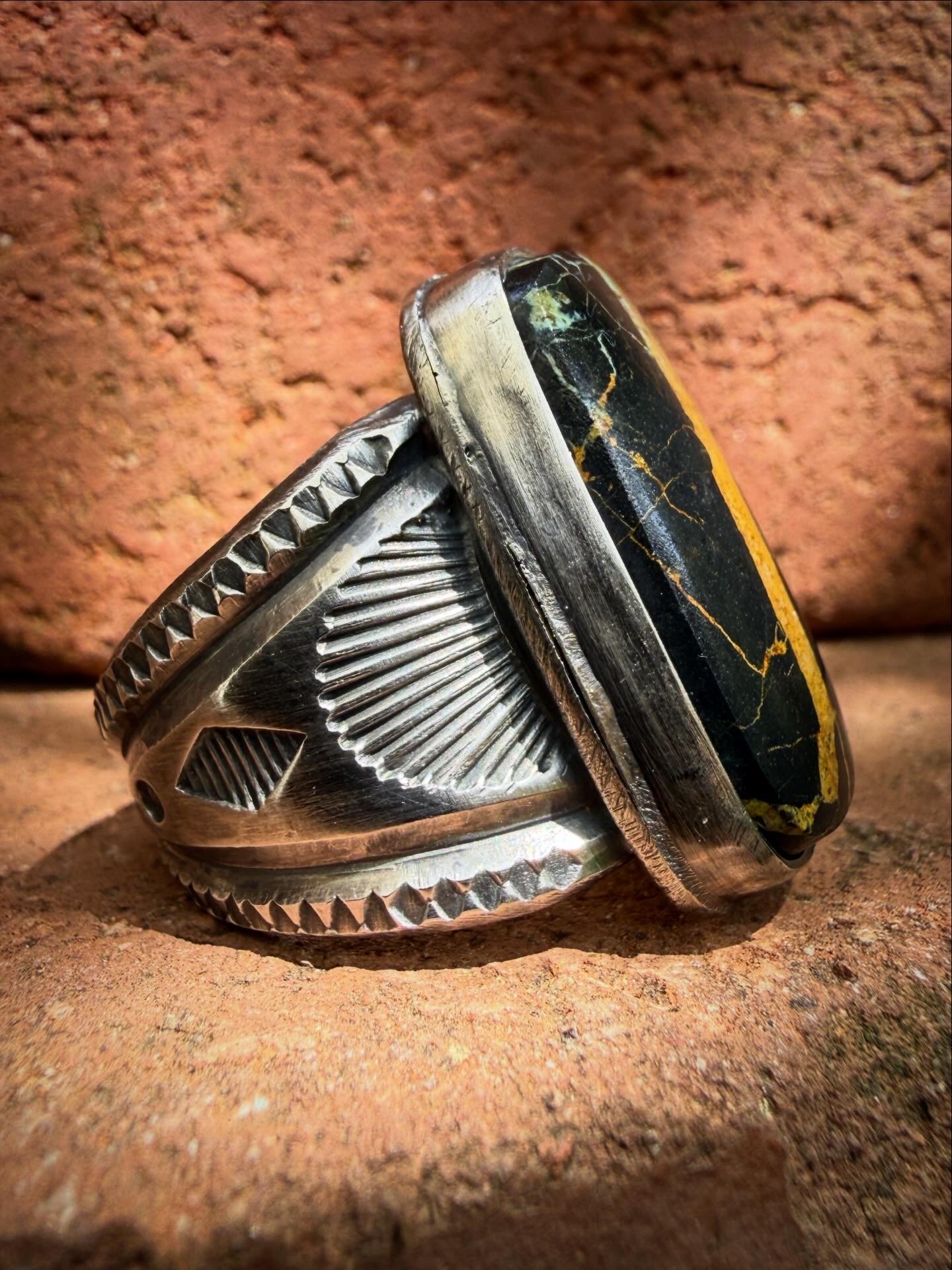 Casted Hand wrought heavy Ingot from repurposed 1890s Sterling Silver, cold chiseled, stamped & crowed with a high grade Black Jack Turquoise. Built the old way, made to last generations!