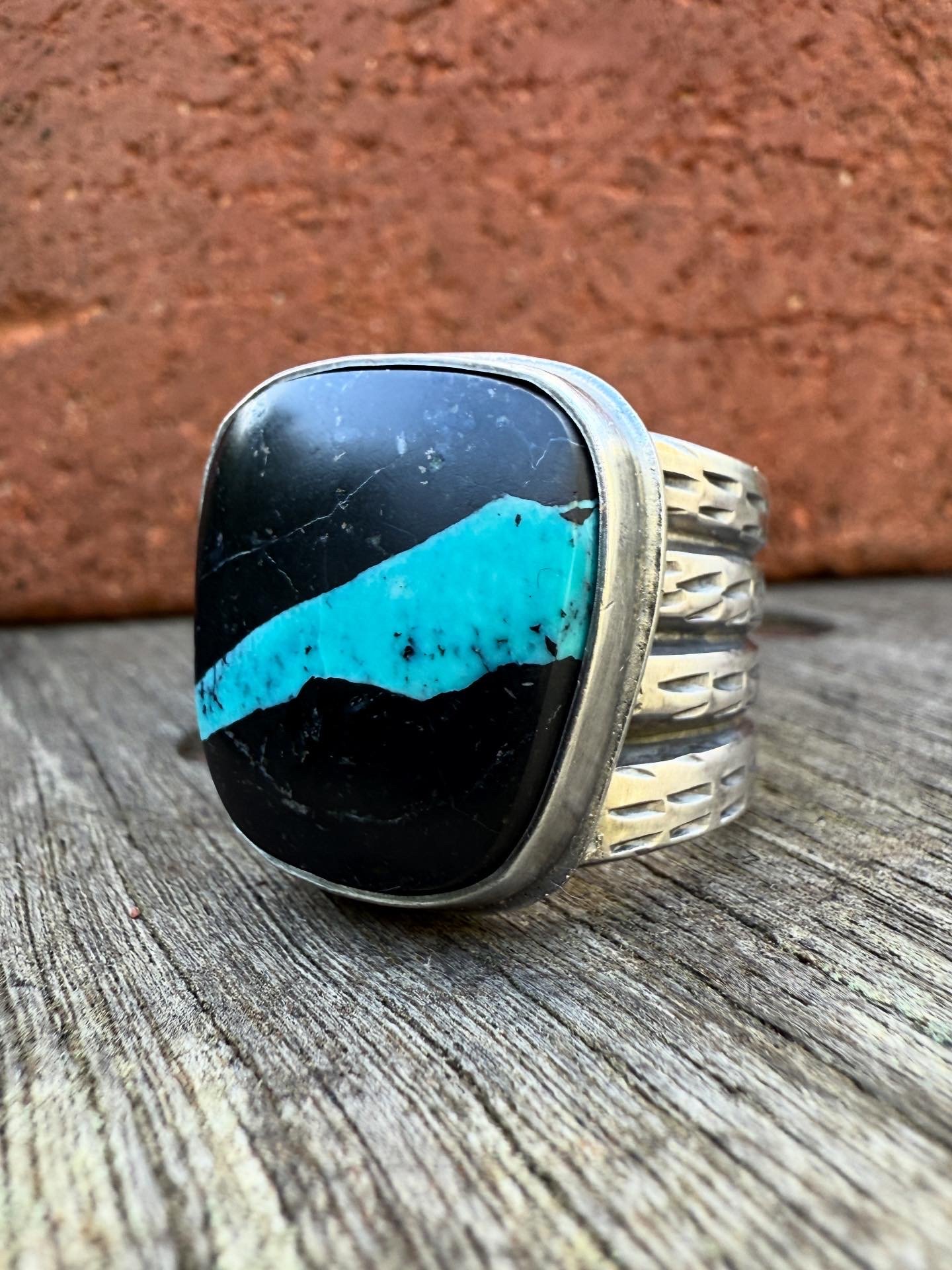 WL&A Handmade Heavy Ingot Cuatro Black Jack RibbonTurquoise Ring - Sizes 11.25