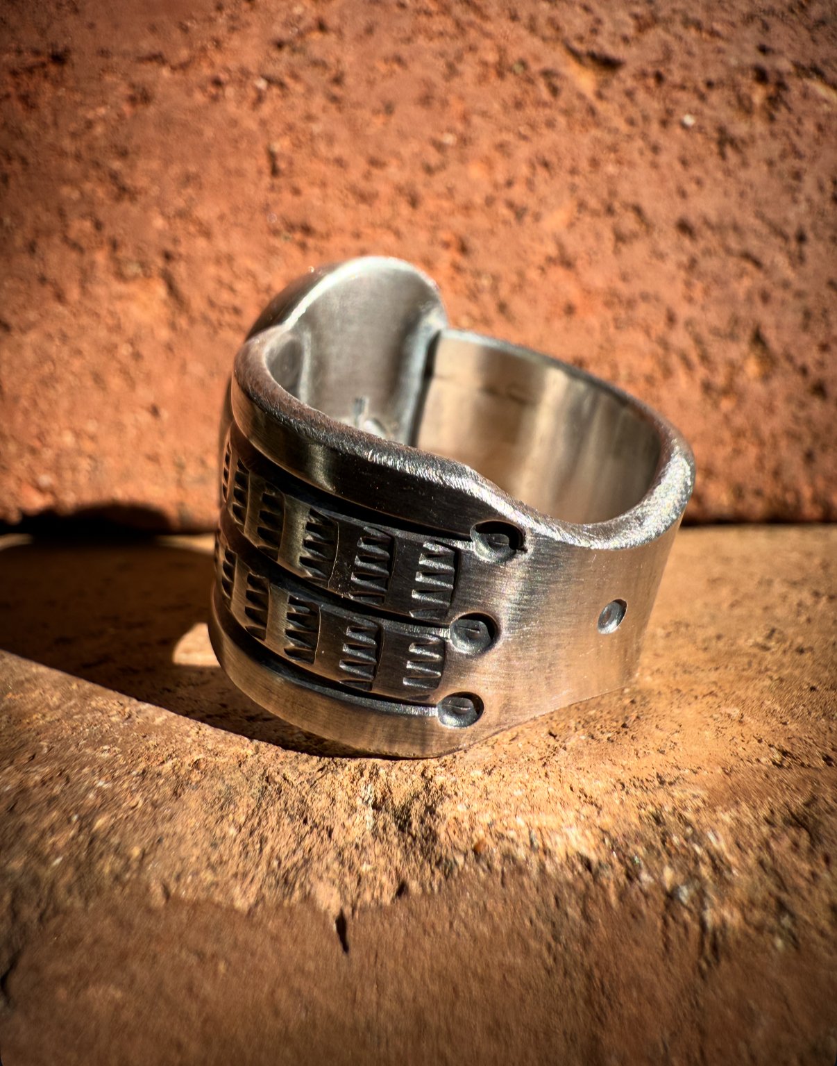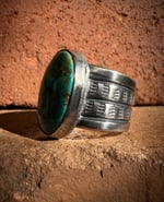 Hand wrought Heavy Ingot from repurposed early 1890s Sterling Silver, cold chiseled split band, stamped, filed and crowned with a beautiful vibrant Oval Green, Blue & Earthy Matrix High Grade Patagonia Turquoise (Arizona). Built to last generations!
