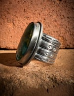 Hand wrought Heavy Ingot from repurposed early 1890s Sterling Silver, cold chiseled split band, stamped, filed and crowned with a beautiful vibrant Oval Green, Blue & Earthy Matrix High Grade Patagonia Turquoise (Arizona). Built to last generations!