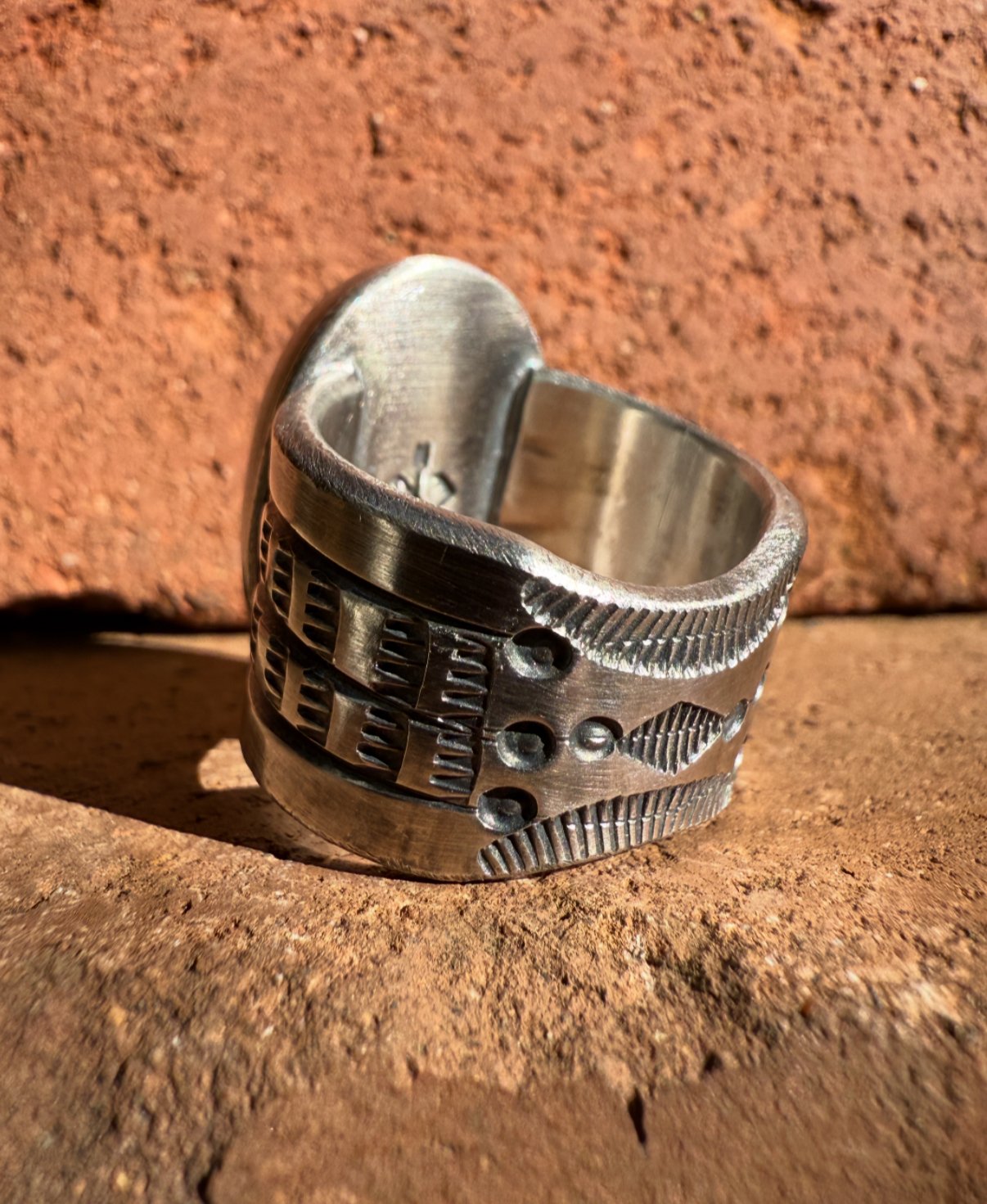 Hand wrought Heavy Ingot from repurposed early 1890s Sterling Silver, cold chiseled split band, stamped, filed and crowned with a beautiful vibrant Oval Green, Blue & Earthy Matrix High Grade Patagonia Turquoise (Arizona). Built to last generations!