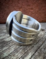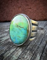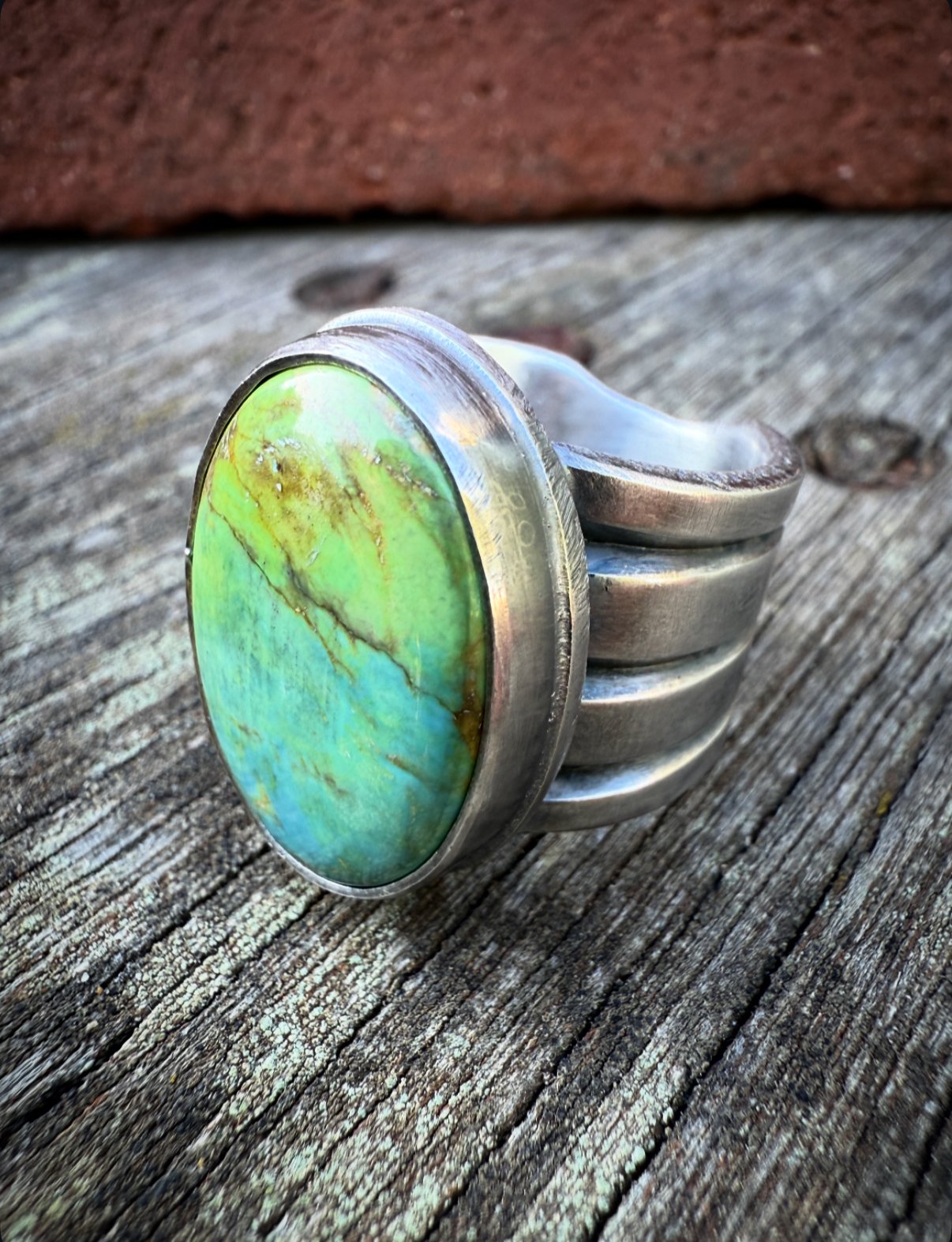 Hand wrought Heavy Ingot from repurposed early 1890s Sterling Silver, cold chiseled split band, stamped, filed and crowned with a beautiful vibrant High Grade Patagonia Green Turquoise (Arizona). Built to last generations!