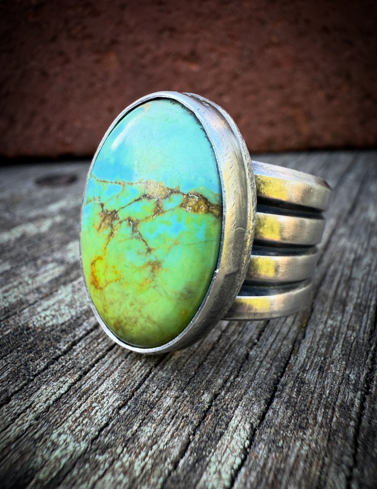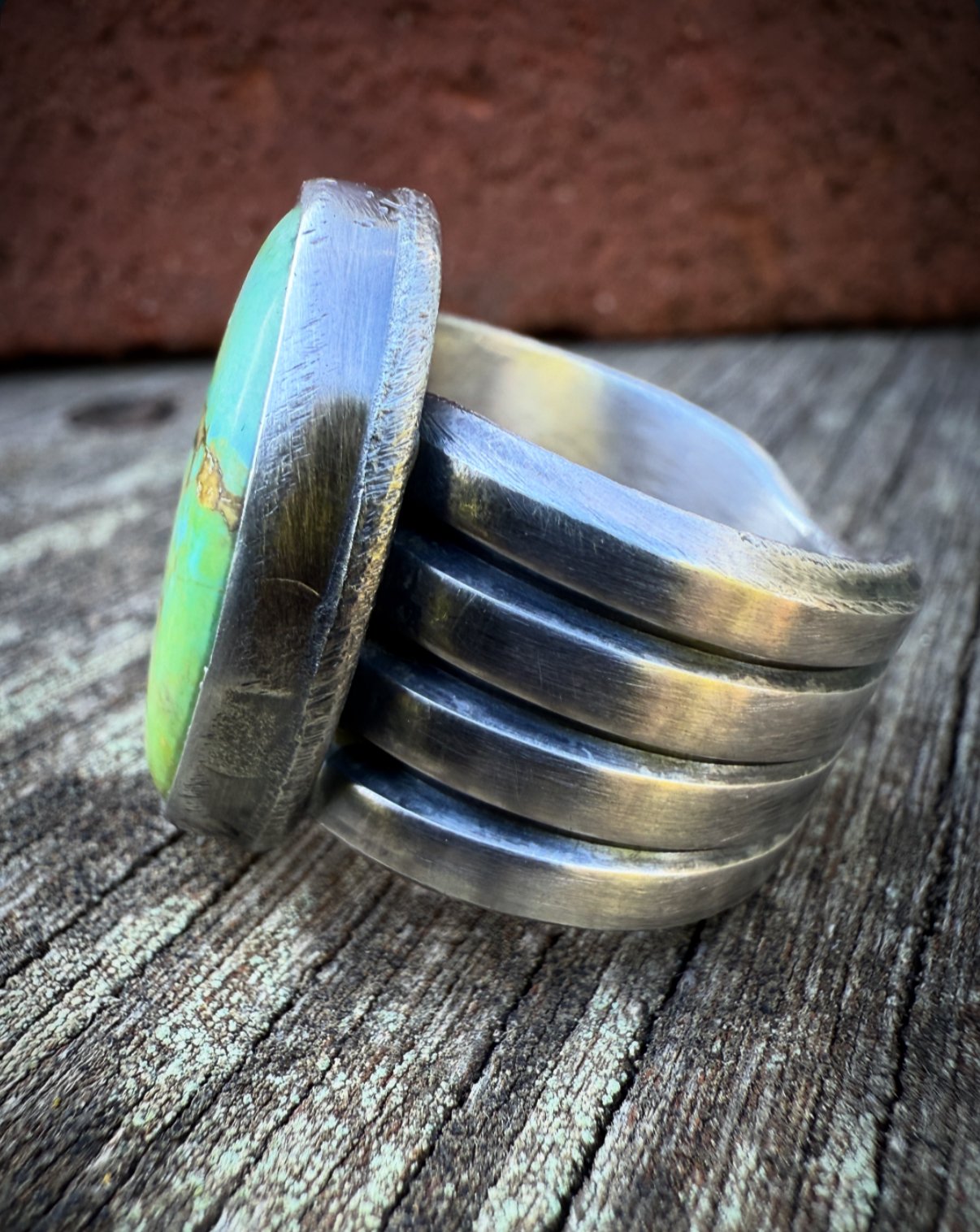 Hand wrought Heavy Ingot from repurposed early 1890s Sterling Silver, cold chiseled split band, stamped, filed and crowned with a beautiful vibrant High Grade Patagonia Green Turquoise (Arizona). Built to last generations!