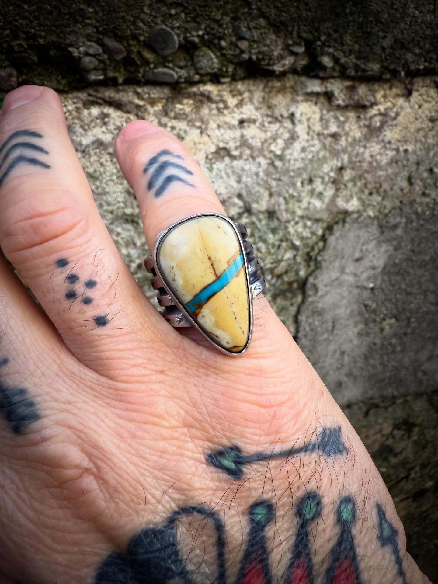 Hand wrought Heavy Ingot from repurposed early 1890s Sterling Silver, cold chiseled split band, stamped, filed and crowned with a beautiful high grade American Turquoise. Built to last generations!