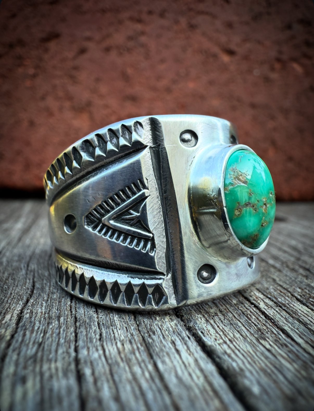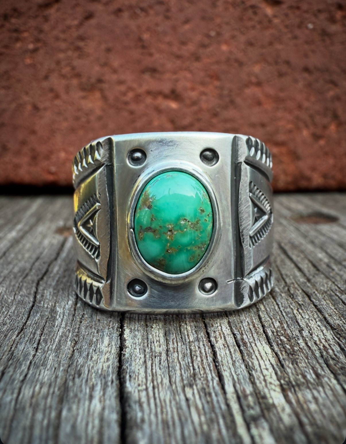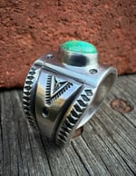 Casted & Hand wrought heavy Ingot from repurposed 1890s Sterling Silver, cold chiseled, stamped & crowed with a high grade green Royston Turquoise. Built the old way, made to last generations!