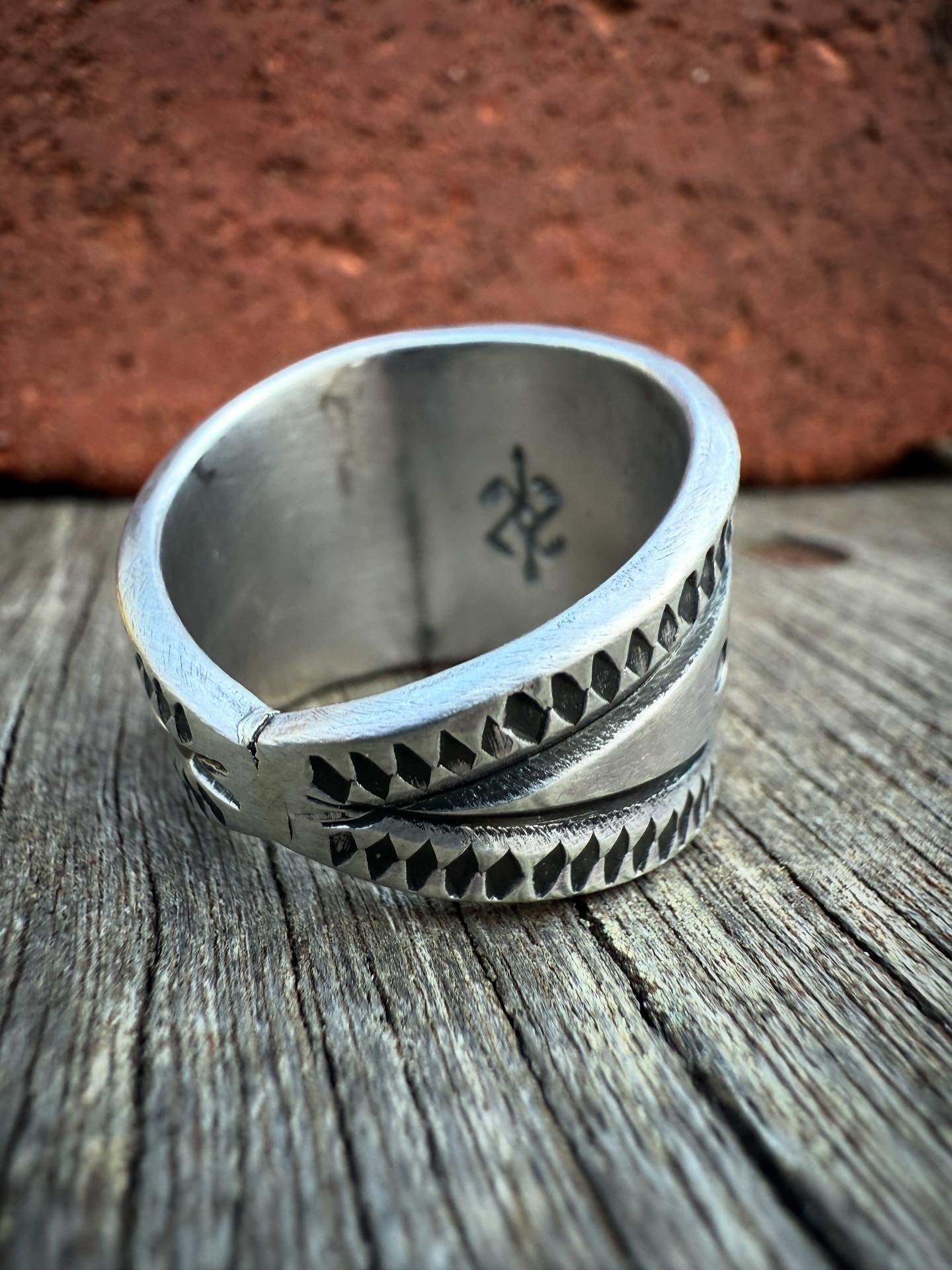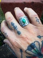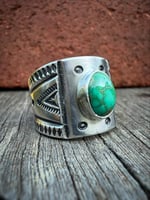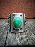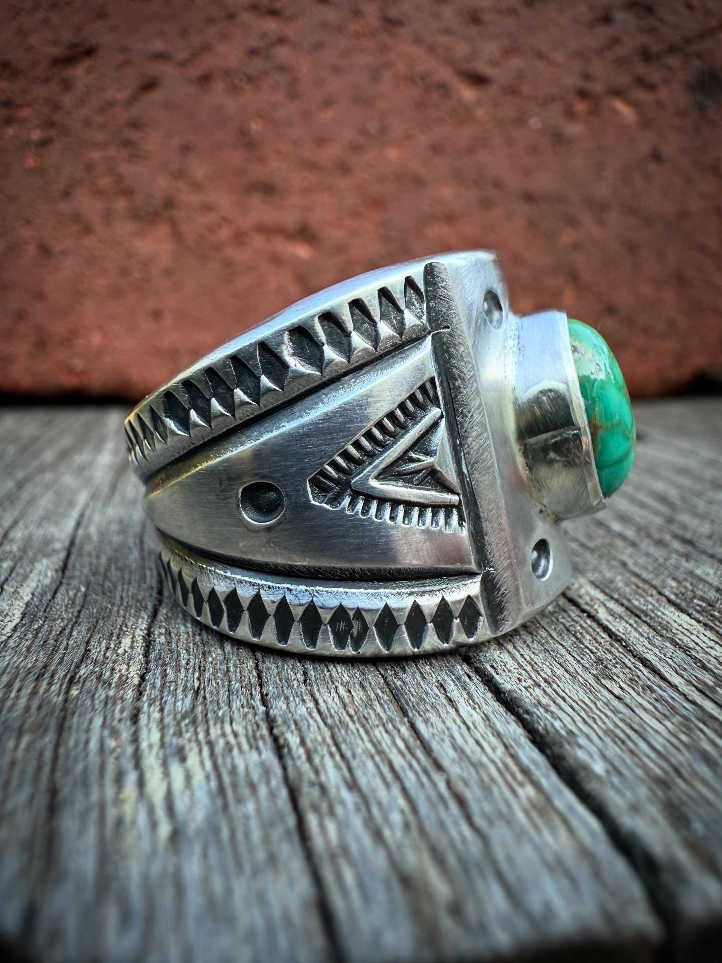 Casted & Hand wrought heavy Ingot from repurposed 1890s Sterling Silver, cold chiseled, stamped & crowed with a high grade green Royston Turquoise. Built the old way, made to last generations!