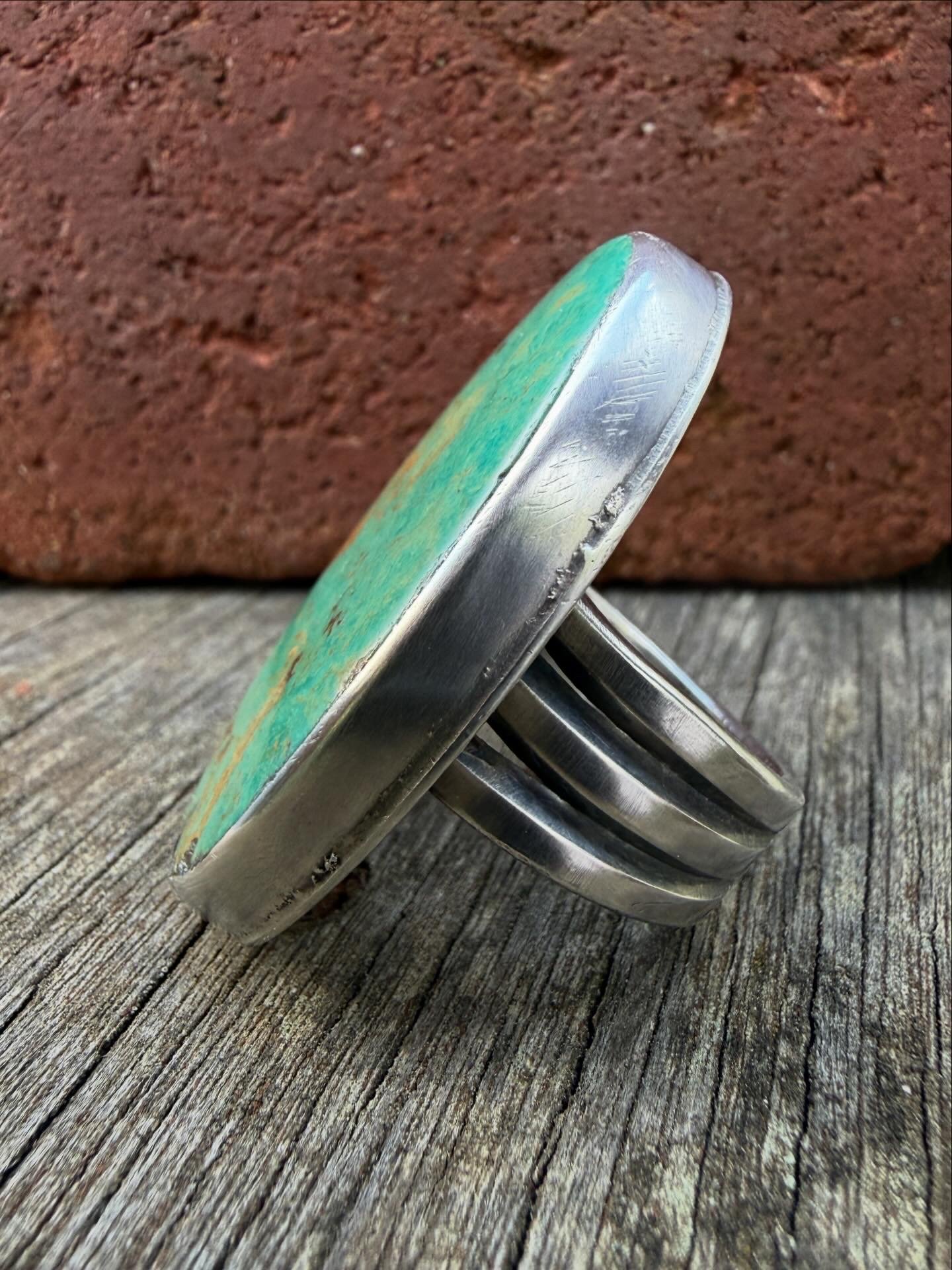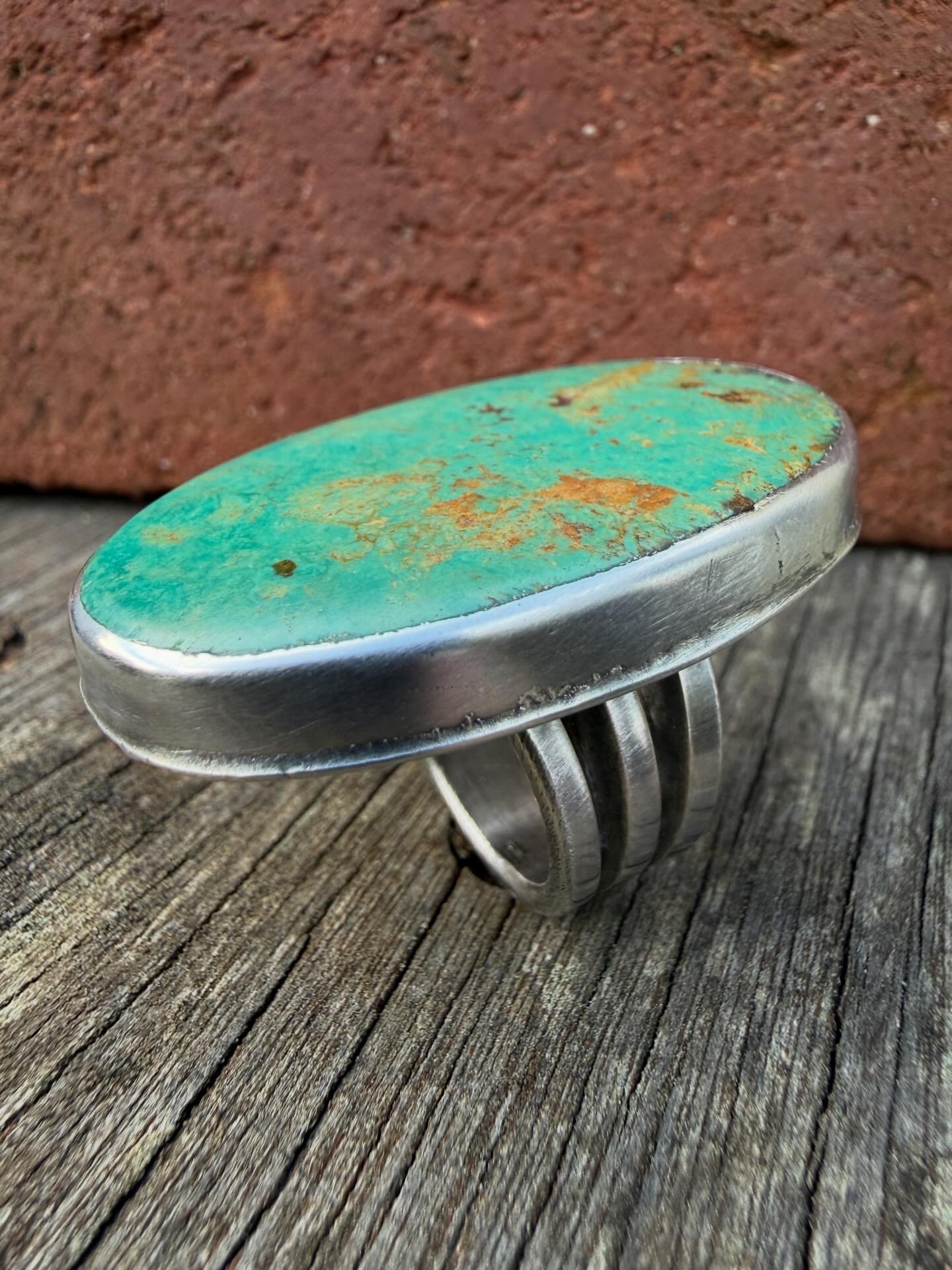 Hand wrought Heavy Ingot from repurposed early 1890s Sterling Silver, cold chiseled split band, stamped, filed and crowned with a beautiful vibrant Oval XL Royston Green Turquoise (43mm x 27mm). Built to last generations!