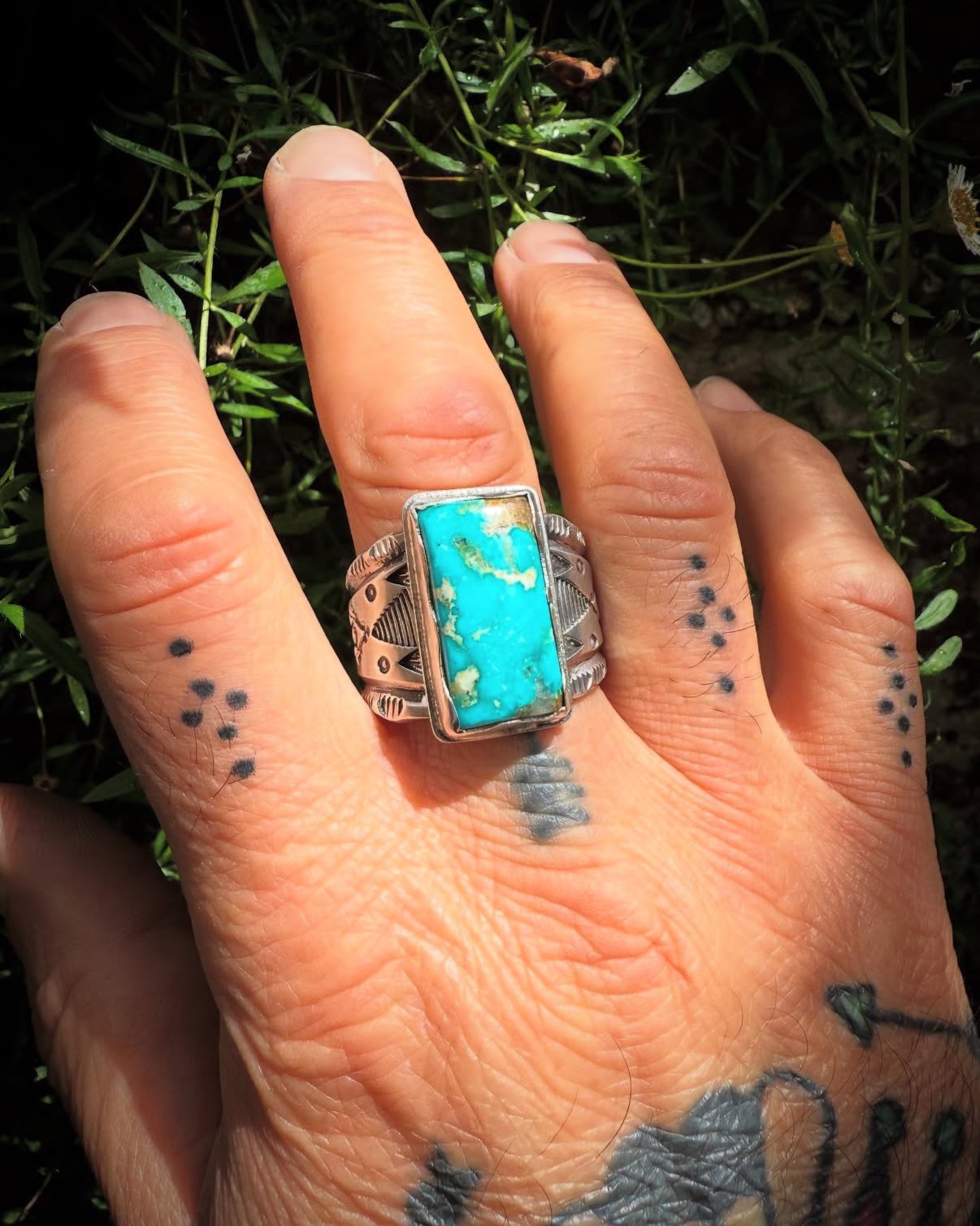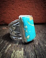 This is a heavy big boy! Hand wrought Heavy Ingot from repurposed early 1890s Sterling Silver, cold chiseled, stamped and crowned in a hand serrated ingot setting with a stunning large High Grade Sonoran Desert Turquoise. Built to last generations!