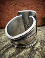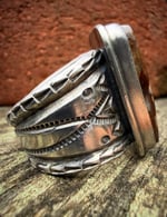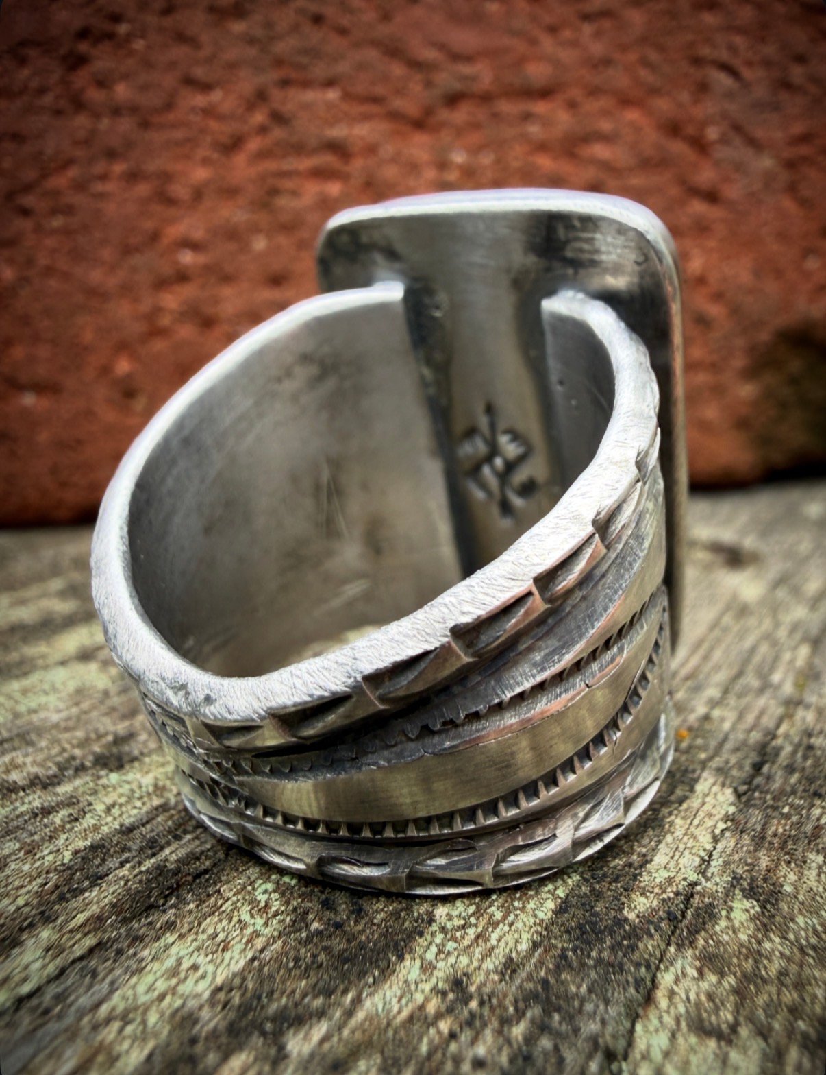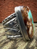 Extra wide hand wrought heavy Ingot band , made from repurposed 1890s Sterling Silver, cold chiseled, old style stamp work with three arrowheads and crowned with a beautiful vibrant Gem Grade Royston Turquoise. Built to last generations!
