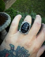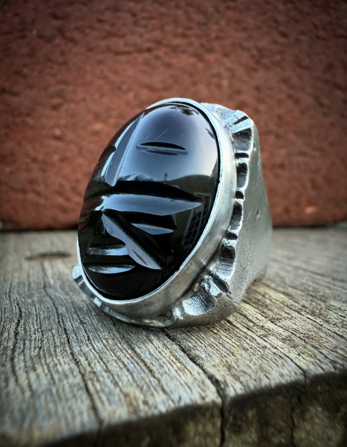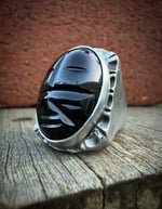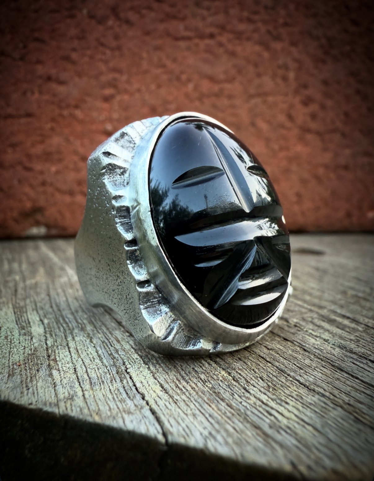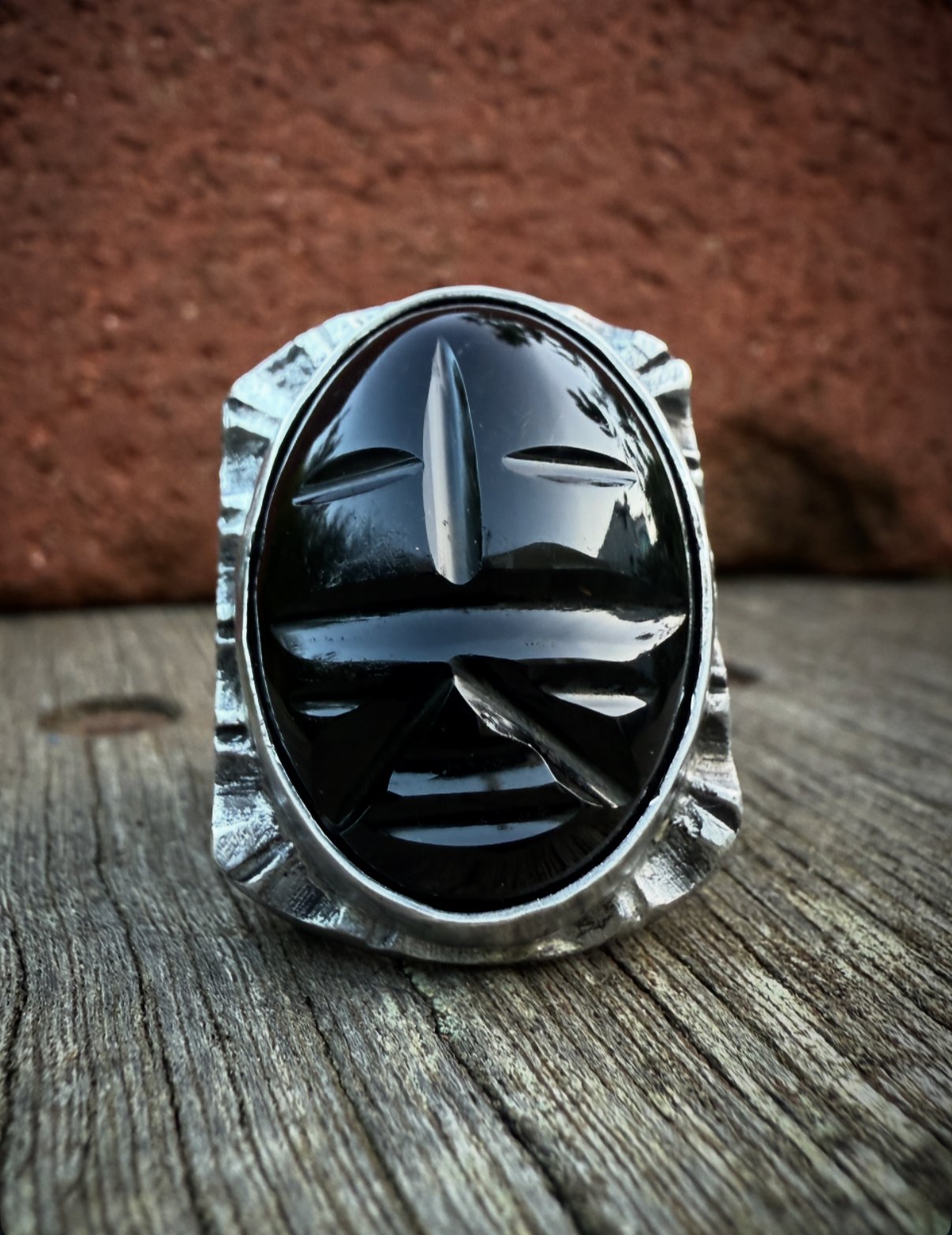 WL&A Handmade Heavy Signet Carved Obsidian Ancestor Mask 1 Ring - Size 10