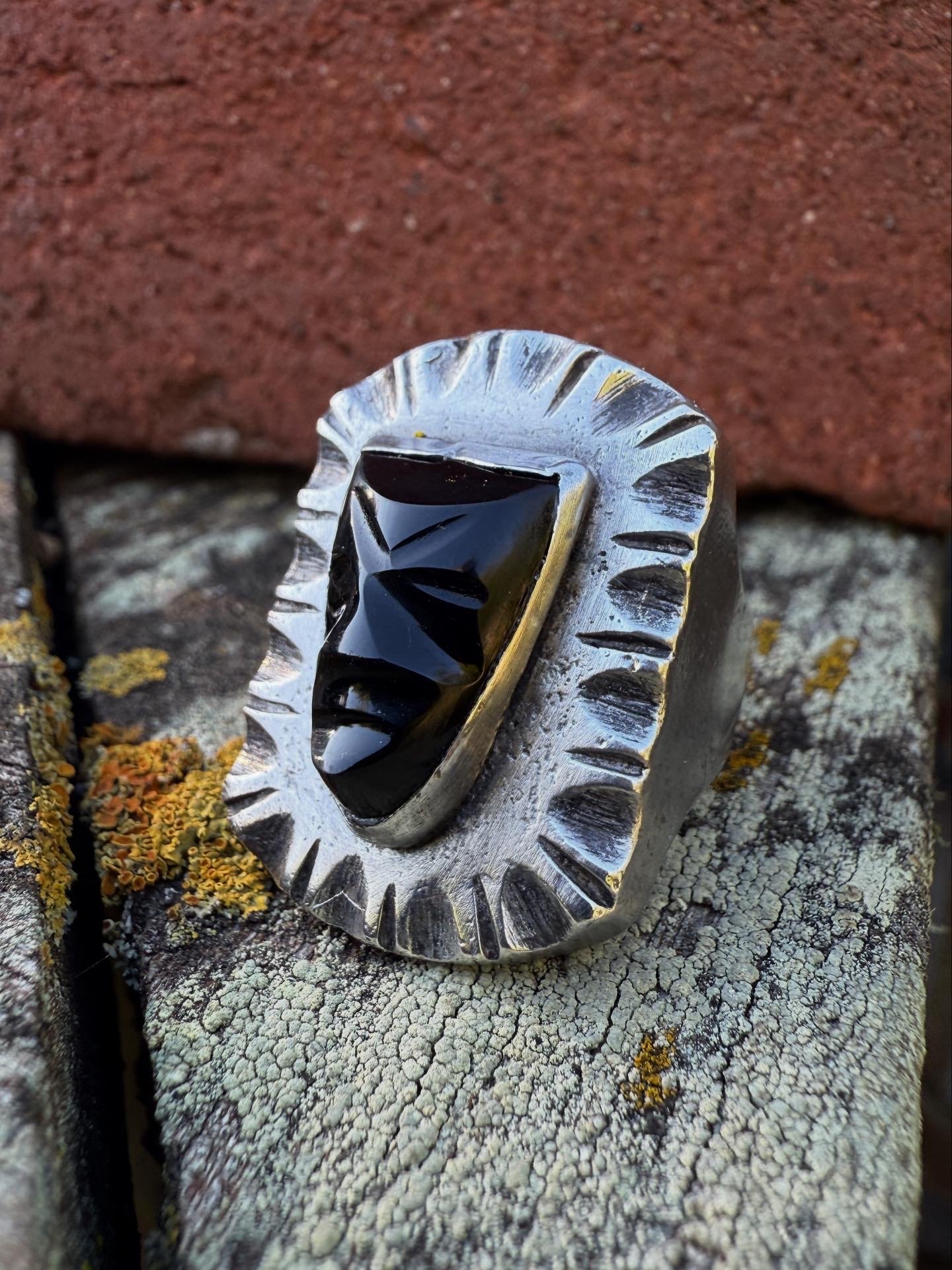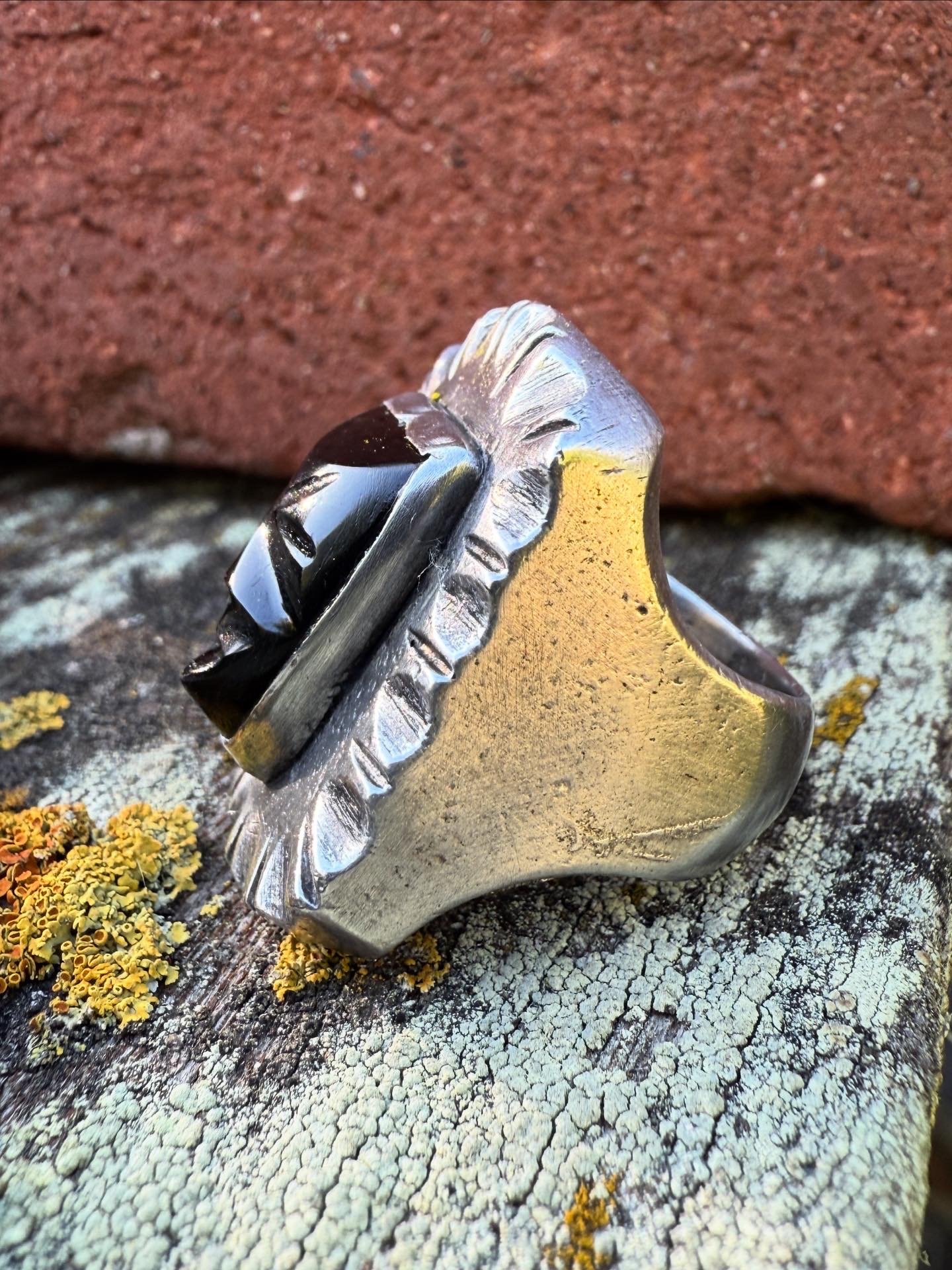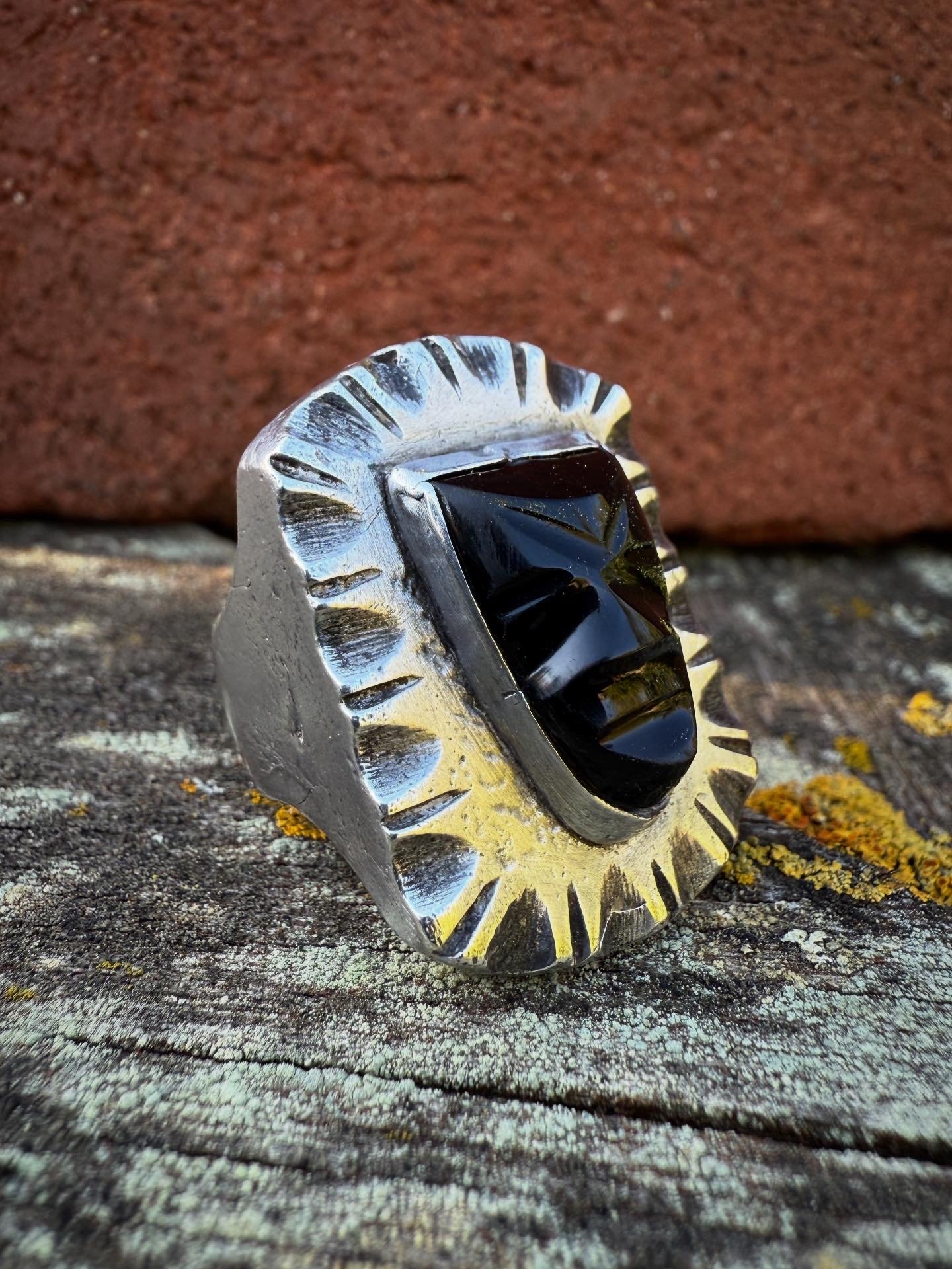 WL&A Handmade Heavy Signet Carved Obsidian Ancestor Mask Rings - Size 9
