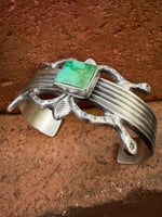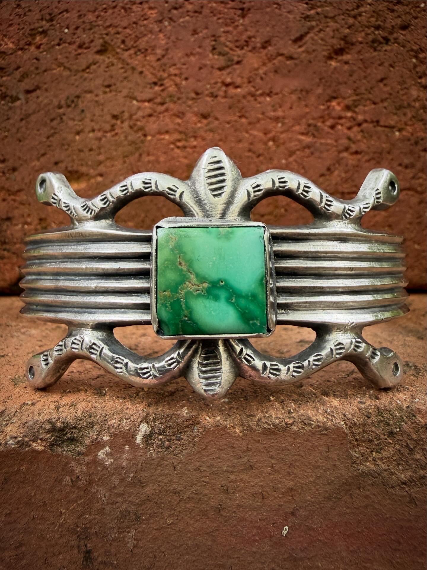 Went super tradish on this piece. Handmade using mix techniques (tufa & sand cast) forged from repurposed 1890s 925 Sterling Silver. Cold chiseled & stamped. Crowned with an amazing National Emerald Valley Turquoise. Old Style classic and built to last generations