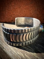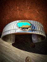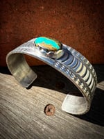 Handmade Ingot Cuff (3/4 width) forged from repurposed 1890s 925 Sterling Silver with heavy old style stamp work & crowned with a stunning Natural Blue Royston Ribbon. Timeless Classic! Built to last generations.
