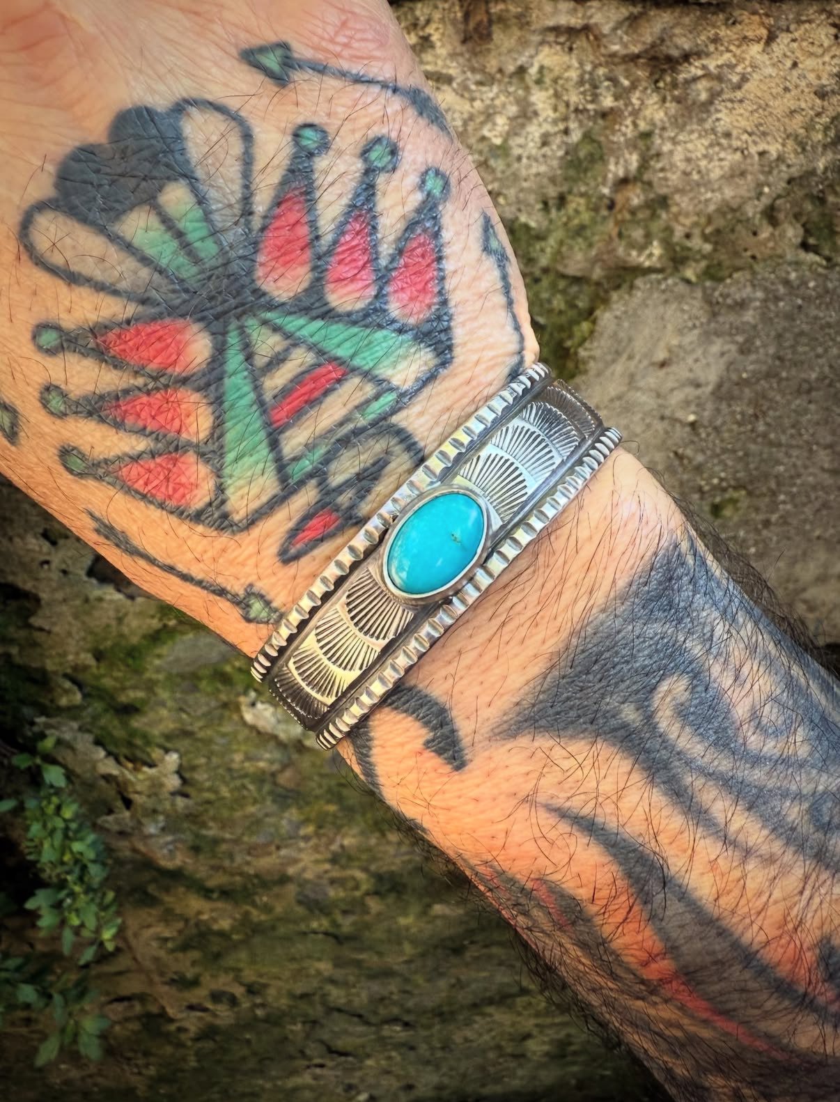 Handmade Ingot Cuff (3/4 width) forged from repurposed 1890s 925 Sterling Silver with heavy old style stamp work. Crowned with a beautiful Navajo Blue (Lone Mt. NV) Turquoise. Timeless Classic! Built to last generations.