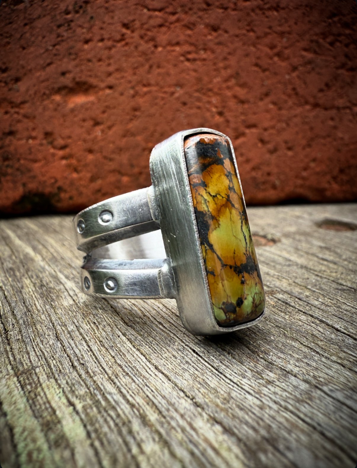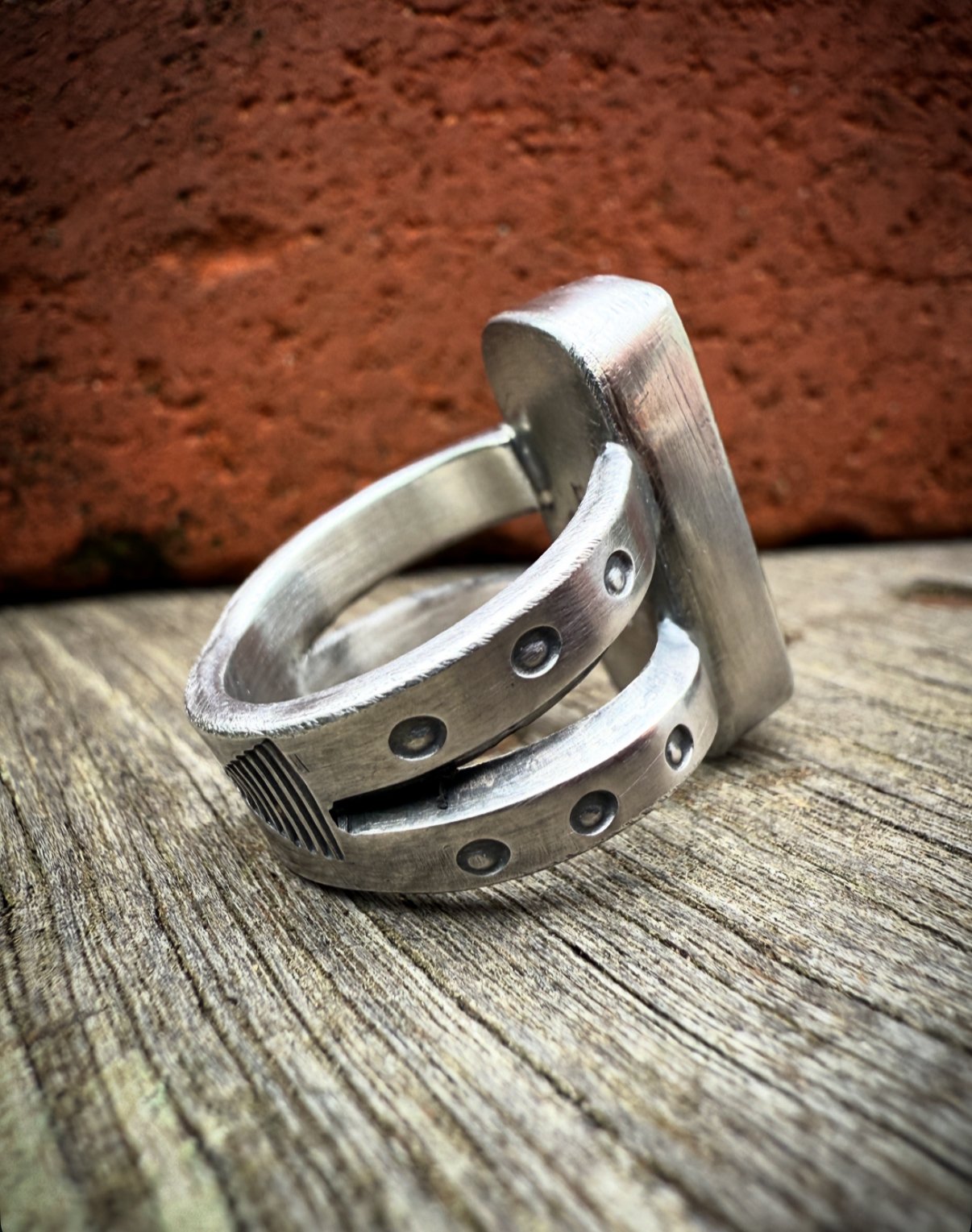 Hand wrought Heavy Ingot from repurposed early 1890s Sterling Silver, cold chiseled split band, stamped, filed and crowned with a beautiful vibrant High Grade American Turquoise. Built to last generations!