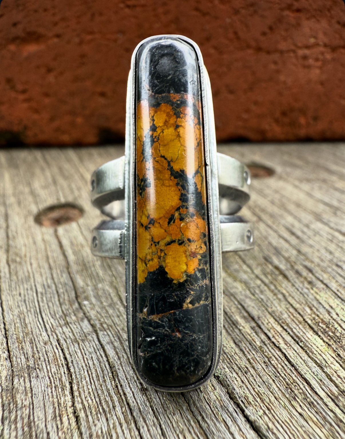Hand wrought Heavy Ingot from repurposed early 1890s Sterling Silver, cold chiseled split band, stamped, filed and crowned with a beautiful vibrant High Grade American Turquoise. Built to last generations!