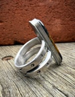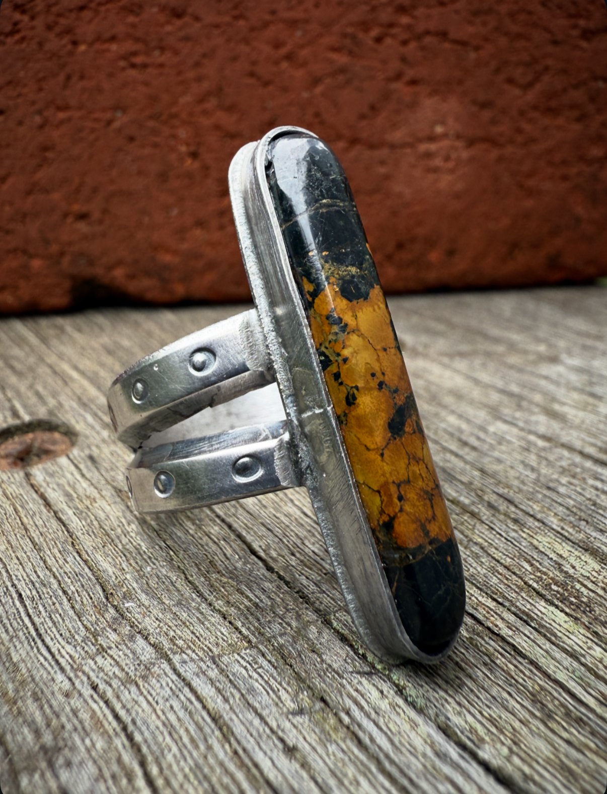 Hand wrought Heavy Ingot from repurposed early 1890s Sterling Silver, cold chiseled split band, stamped, filed and crowned with a beautiful vibrant High Grade American Turquoise. Built to last generations!