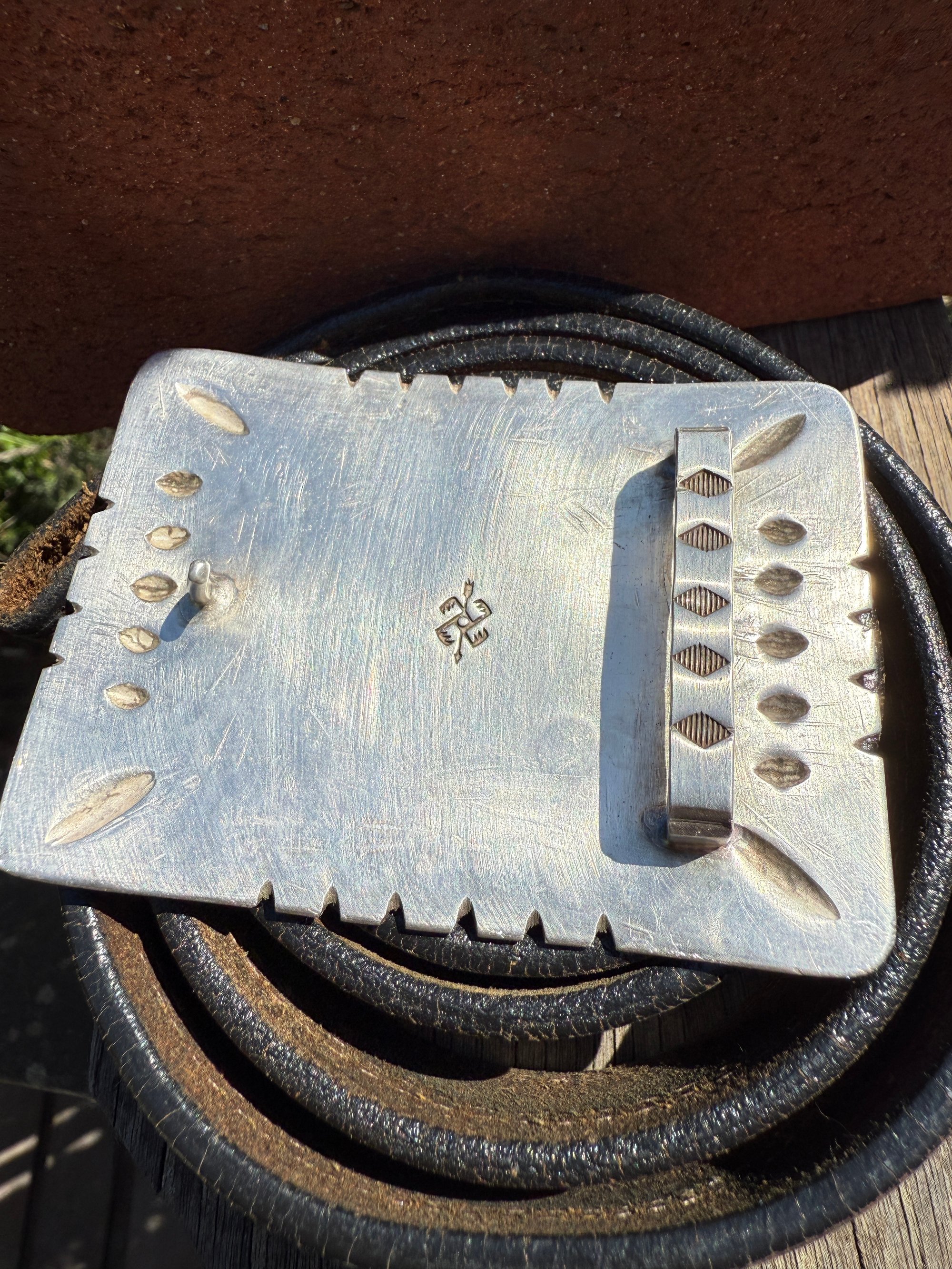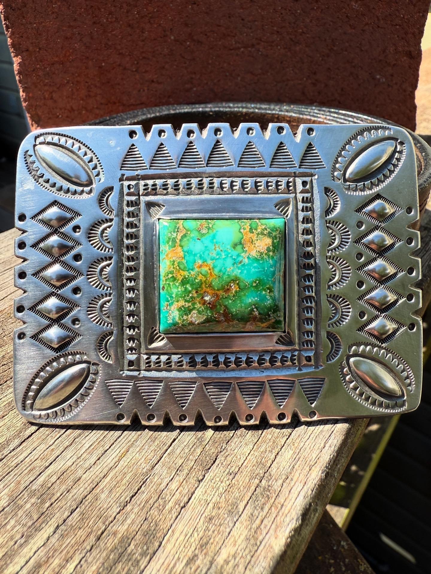 Handmade entirely with forged repurposed 1890s 925 Sterling Silver ingot. Hand wrought, cold chiseled, embossed, stamped & shaped the old way. Fire & hammer. Crowned with an amazing Complex Matrix High Grade Sonoran Desert Turquoise (30mm x 25mm). Set for 1.5 inch belt loop. Old style built to last generations.