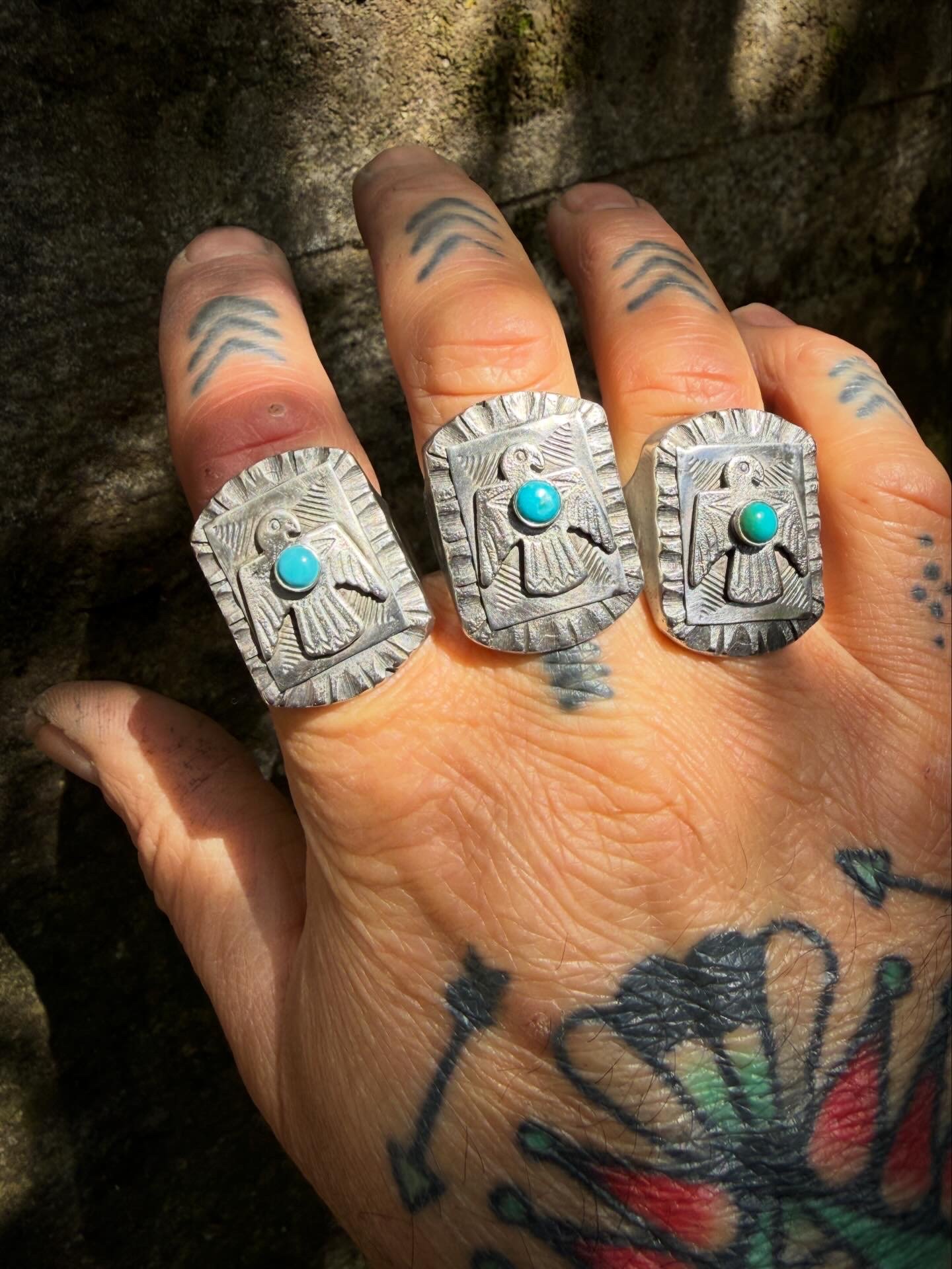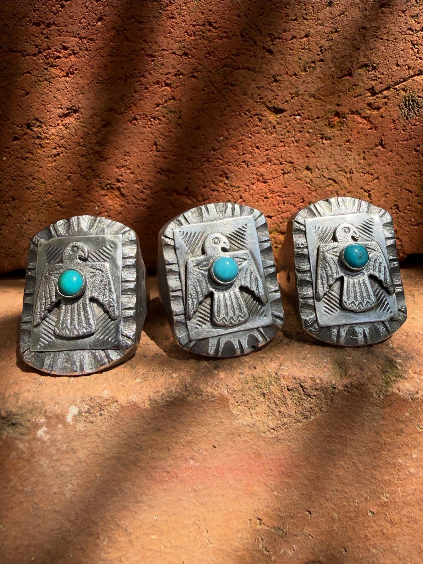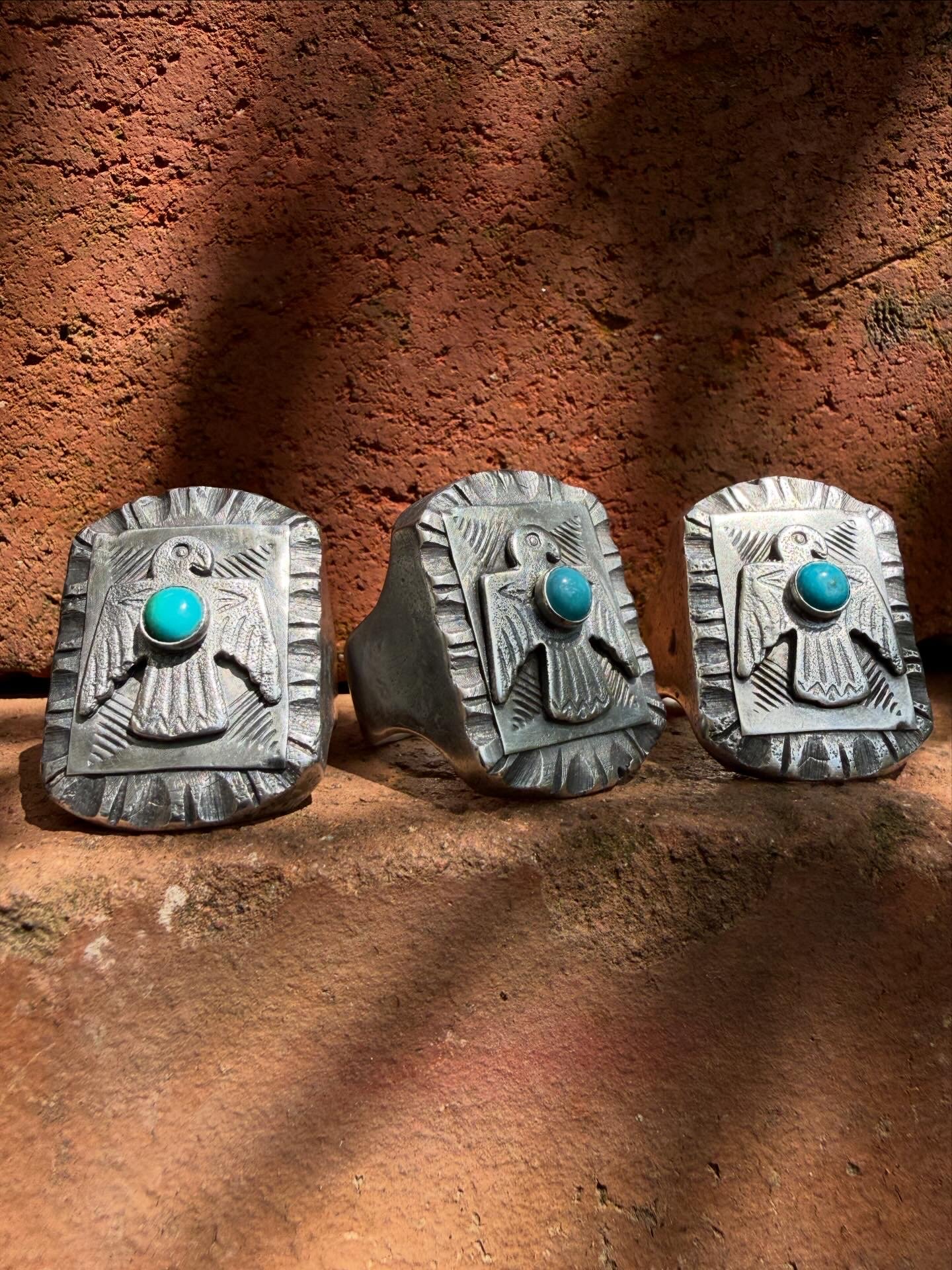 These heavy signets are made with 925 Sterling Silver, layered with early 1900s curio style Thunderbirds & crowned with 5mm Carico Lake Blue Snake Eye Turquoise . Chunky, Old school & built to last generations!