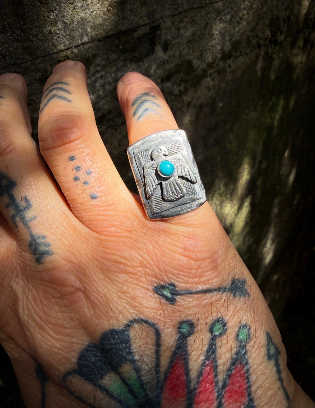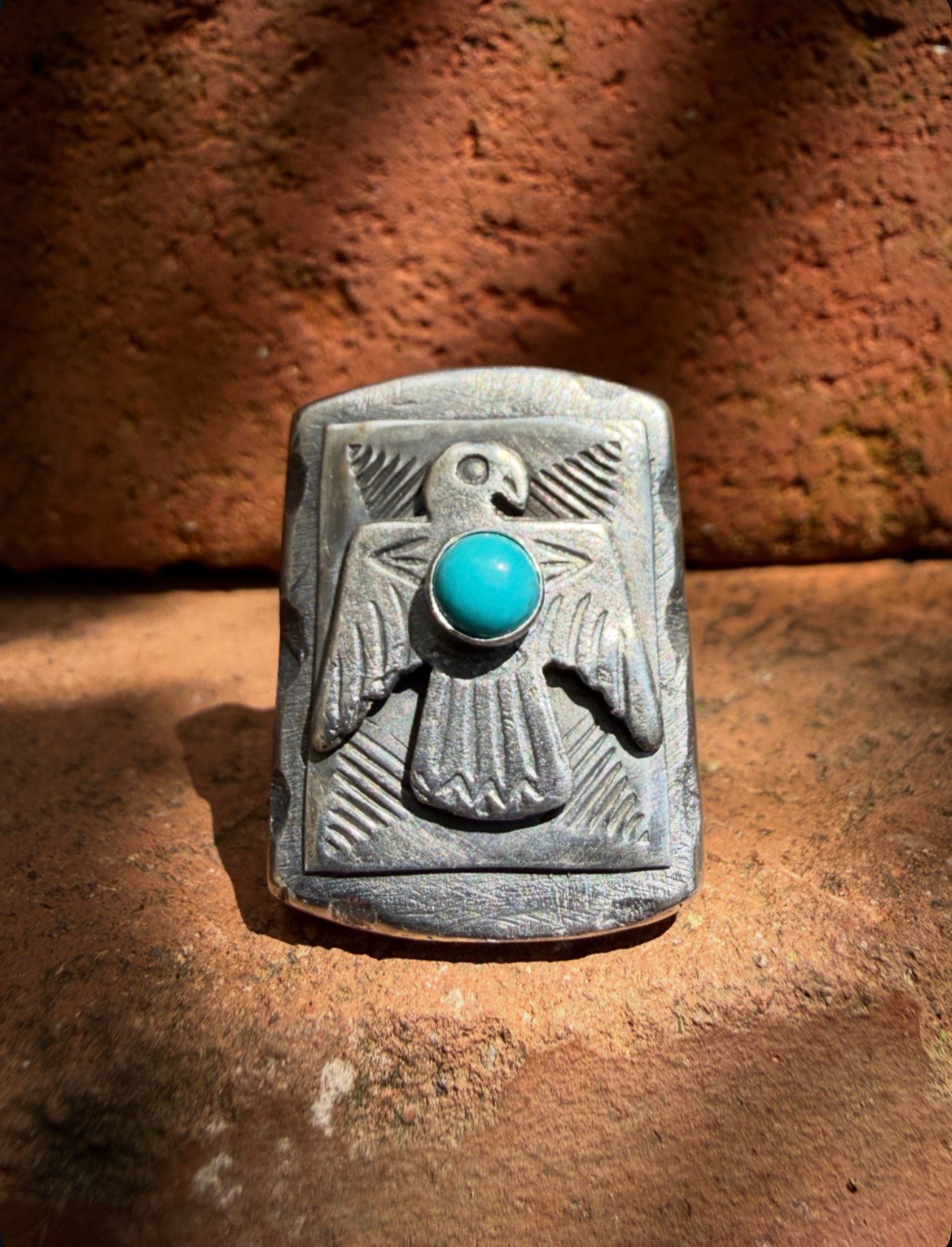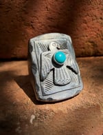 These heavy signets are made with 925 Sterling Silver, layered with early 1900s curio style Thunderbirds & crowned with 5mm Carico Lake Blue Snake Eye Turquoise . Chunky, Old school & built to last generations!