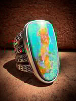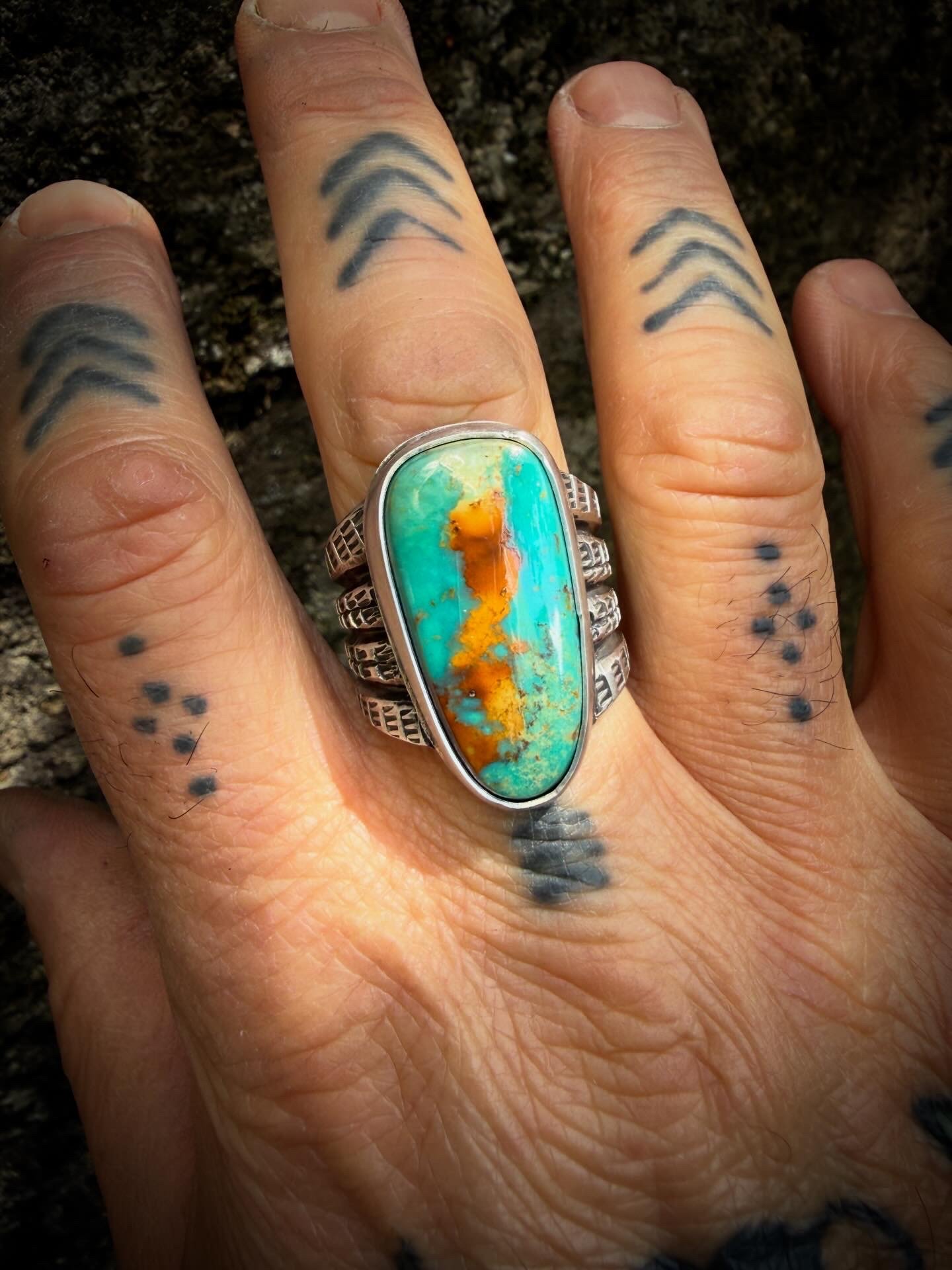 This hand wrought extra wide heavy ingot split band ring is made entirely with repurposed early 1890s Sterling Silver, cold chiseled, stamped and crowned with an amazing vibrant Gem Grade Royston Turquoise. Built to last generations!