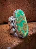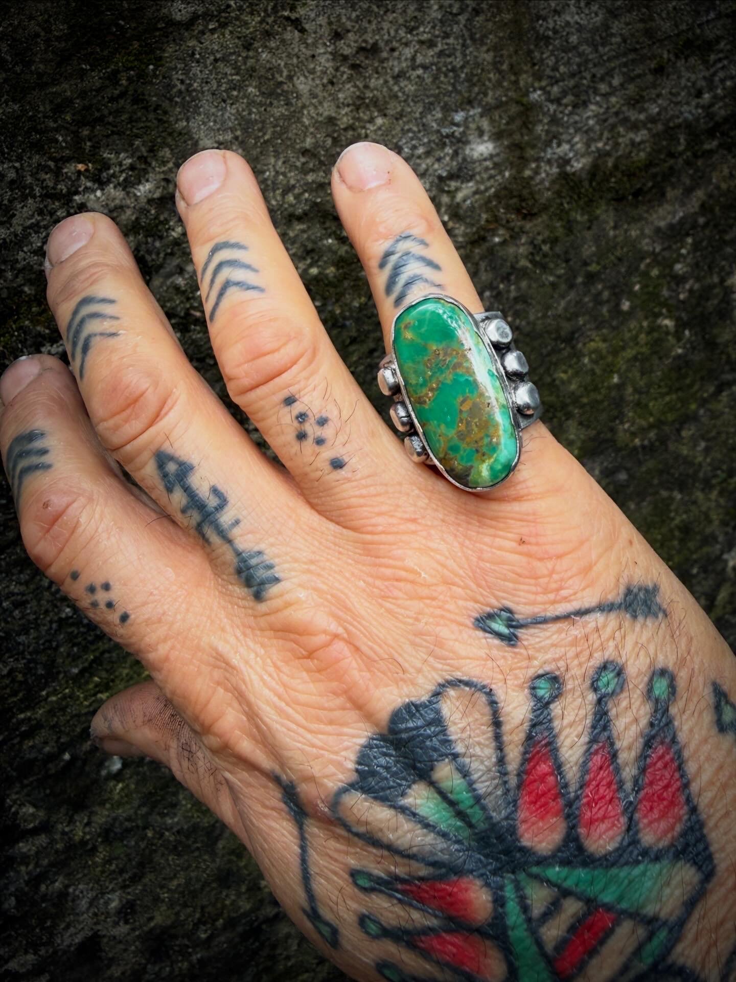 Hand wrought extra wide heavy ingot split band ring made entirely with repurposed early 1890s Sterling Silver, cold chiseled, stamped, layered with sterling medicine drops and crowned with an amazing vibrant Natural Forest Green Royston Turquoise. Built to last generations!