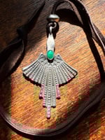 Old Style Large Heavy Ingot Medicine Bird, hand wrought from repurposed 1890s Sterling Silver, cold chiseled, sawed, stamped, filed and crowned with Green high grade Royston Turquoise. Strung on 10mm width x 26" long Deer Leather with Handmade Silver Mercury Dime Bead. Always handmade & built to last generations!