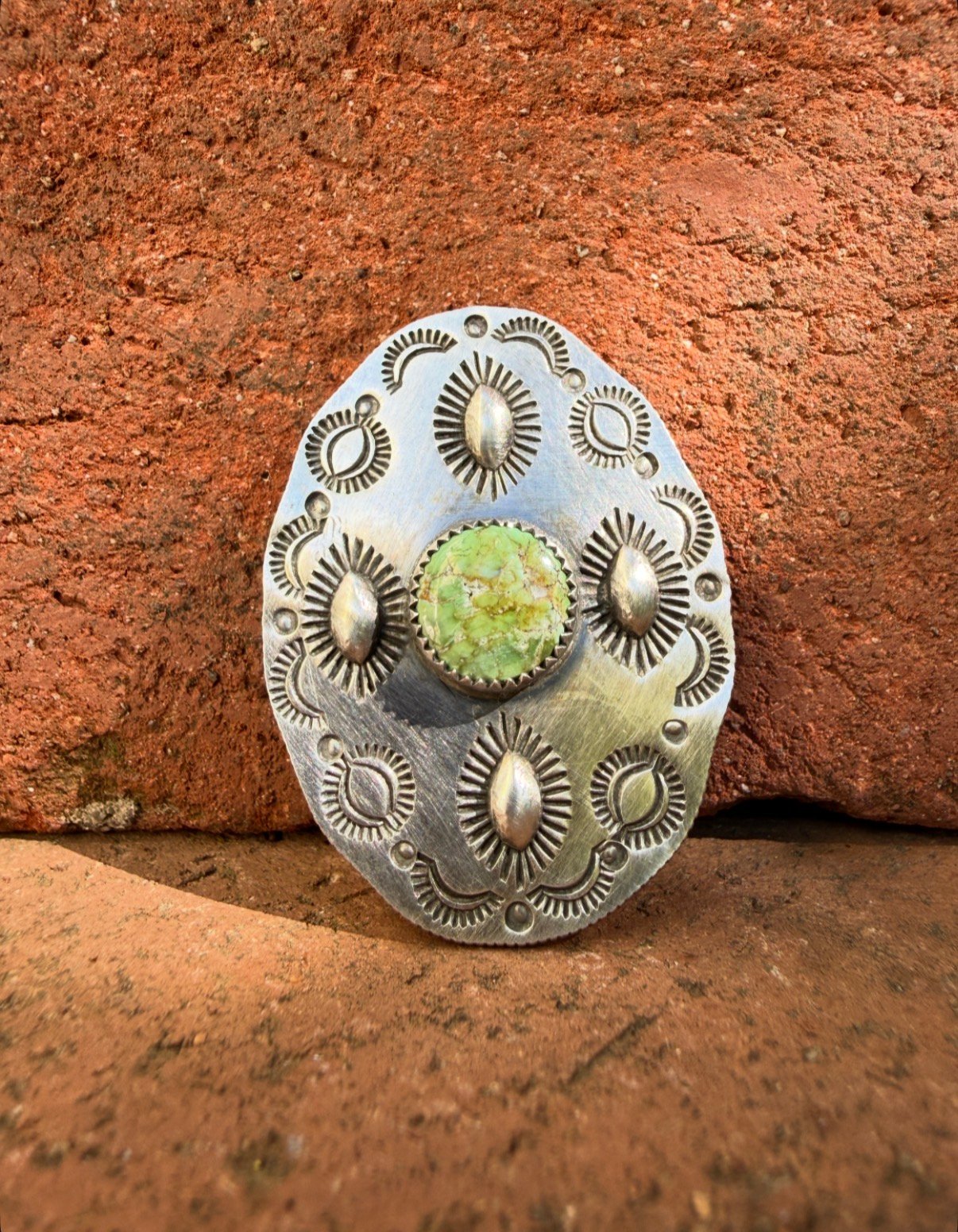 Handmade using Silver Liberty Walking Half Dollar coins (date codes 1916-1921). Hand wrought, embossed, stamped & shaped the old way. Fire & hammer. Crowned with a High Grade Green Carico Lake Turquoise. Old style built to last generations.