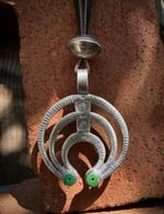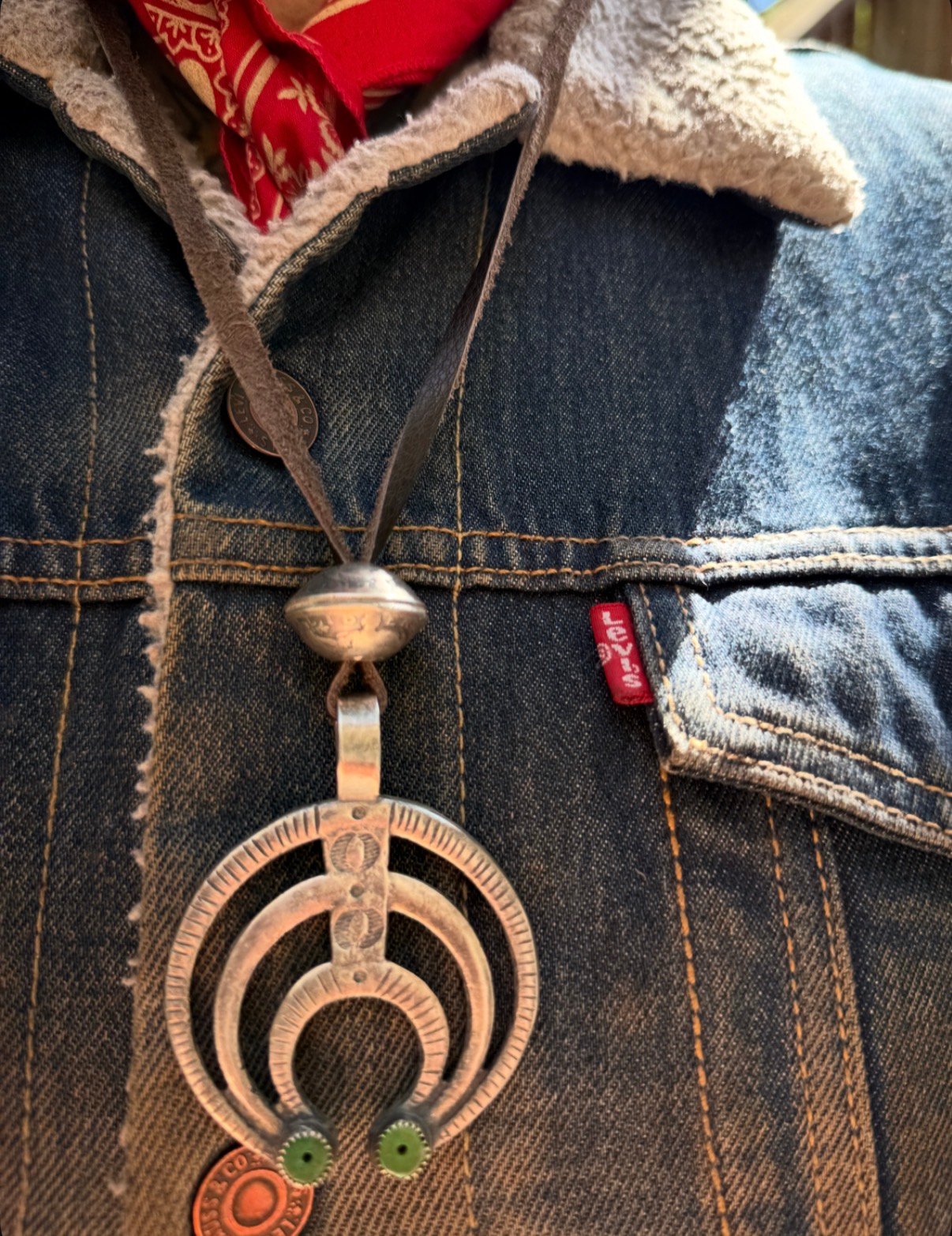 Handmade old style classic Naja. Repurposed entirely from 1890s 925 Sterling Silver - Tufa Cast, Hammer, saw, file & stamped. Crowned with two (2) beautiful Vintage Forest Green Royston Heishi Turquoise strung on Deer with a handmade Silver Liberty Walking Half Dollar Pearl. Old School and built to last generations