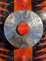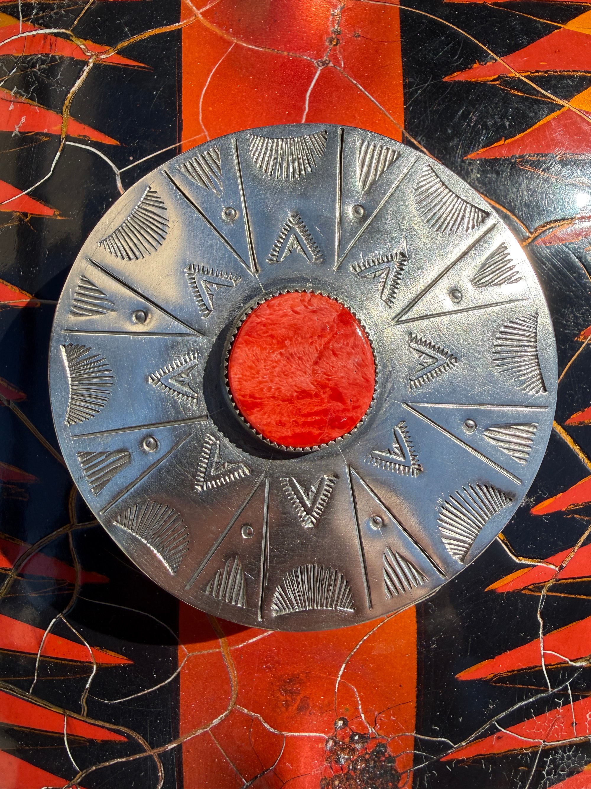 Started out with a 1884 Morgan Silver Dollar hand wrought, shaped, stamped, layered, filed and crowned with beautiful Red Sponge Coral Cab. Old style and made to last generations.
