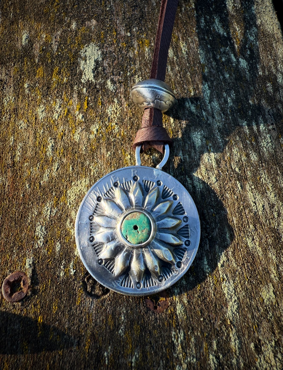 Tooled + stamped Peace Silver Dollars (dates 1920s-1930s) & crowned with Vintage Heishi Royston Turquoise. Strung on 26" adjustable deer leather with handmade Silver Mercury Dime pearl. Old Style classic and built to last generations.