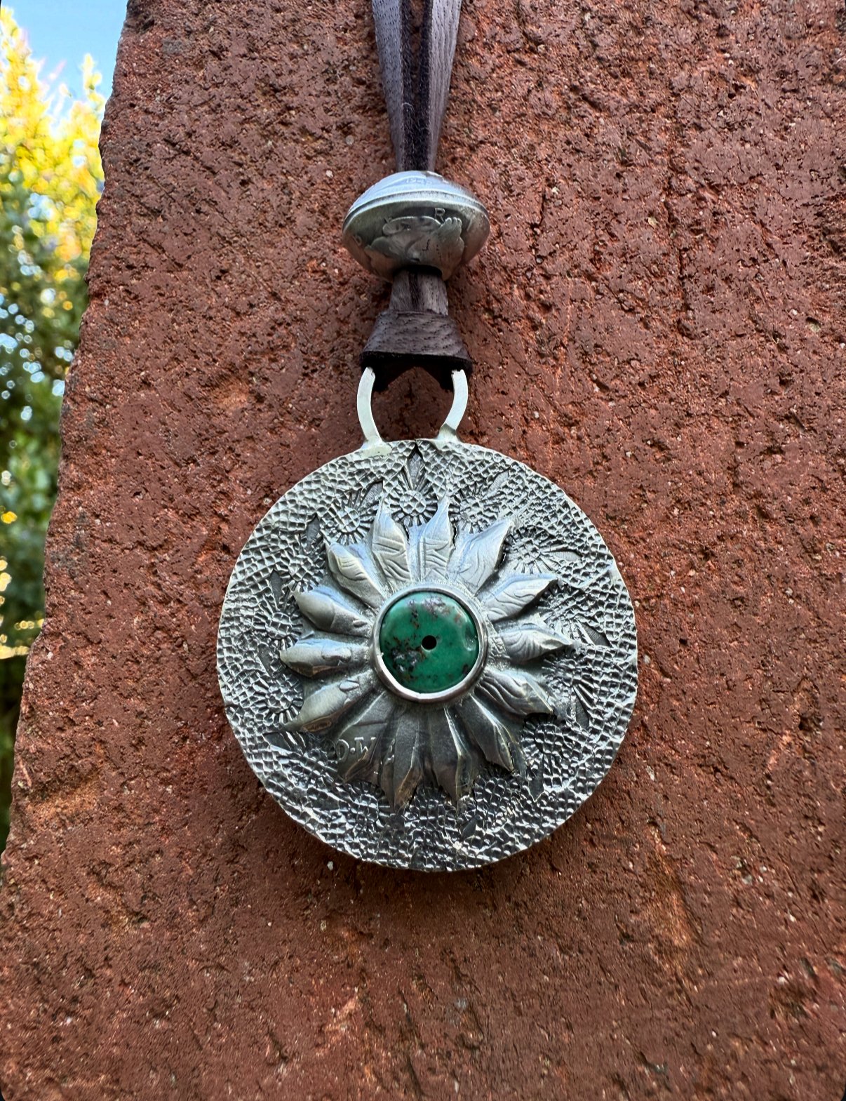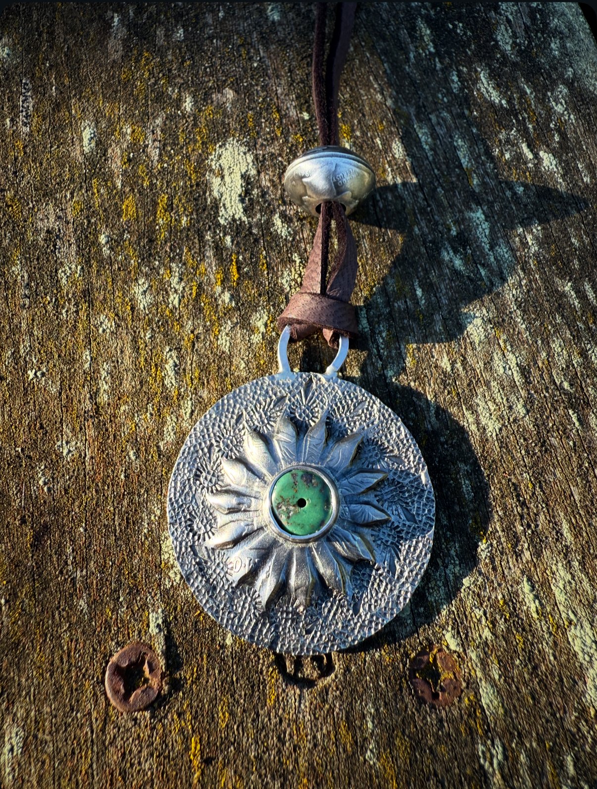 Tooled + stamped Peace Silver Dollars (dates 1920s-1930s) & crowned with Vintage Heishi Royston Turquoise. Strung on 26" adjustable deer leather with handmade Silver Mercury Dime pearl. Old Style classic and built to last generations.