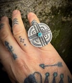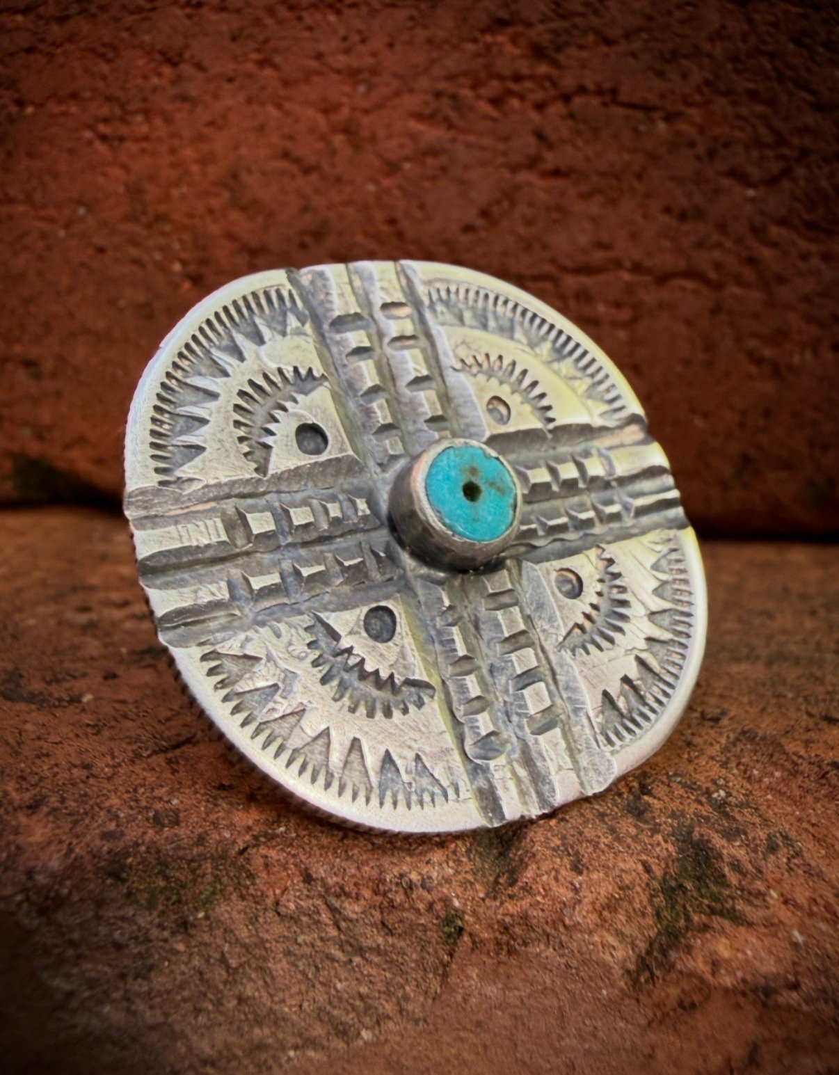 Handmade stamped Walking Liberty Silver Half Dollars (dates 30s-40s), split band ingot, crowned with High Grade Royston Blue Heishi Bead Turquoise. Old Style classic and built to last generations.