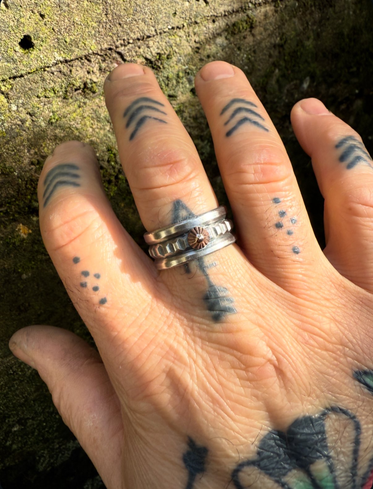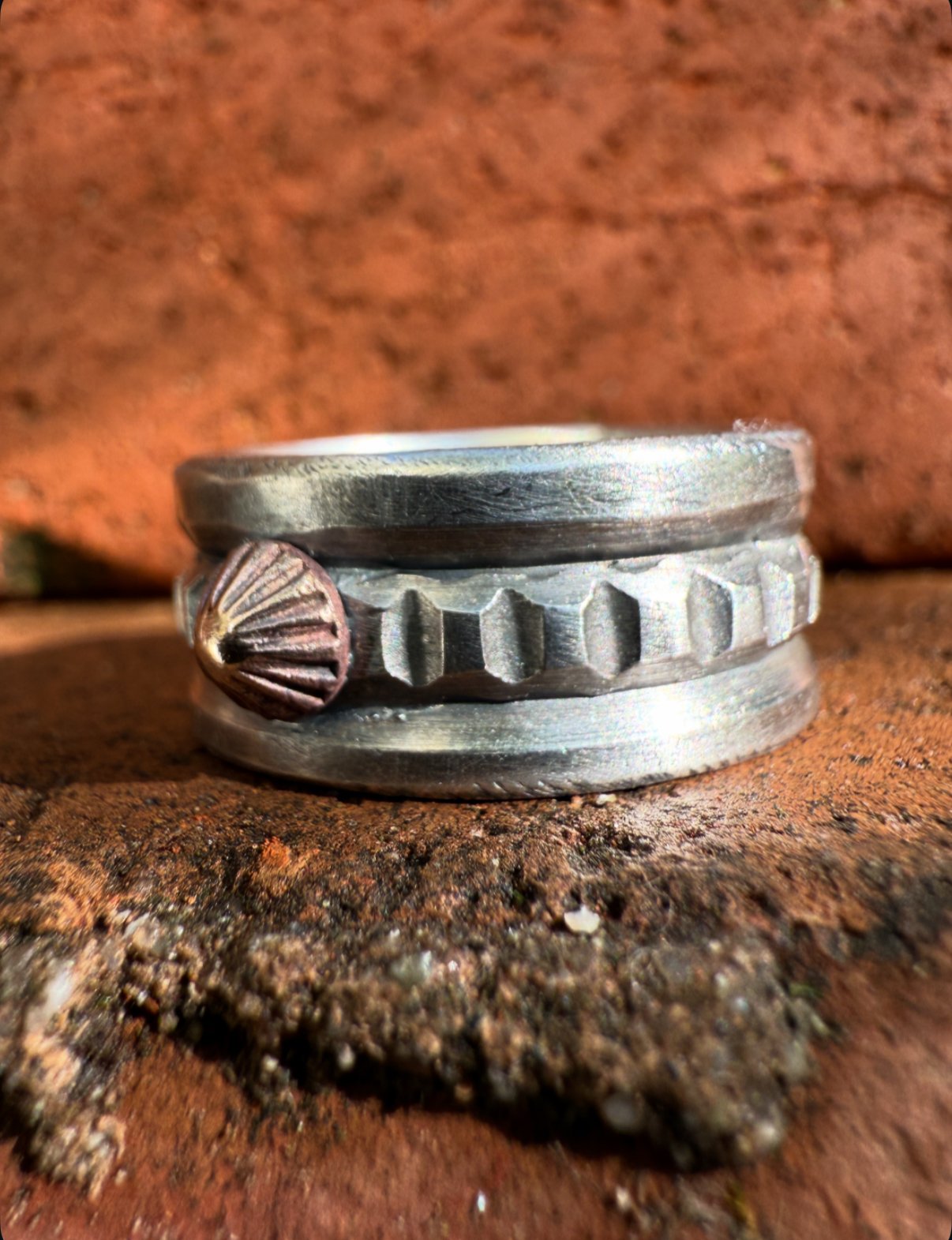 Hand wrought heavy Ingot (1/2 wide) from repurposed early 1890s Sterling Silver, cold chiseled, stamped, filed and crowned with an Ancient Bronze Peak. Built to last generations!