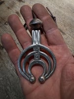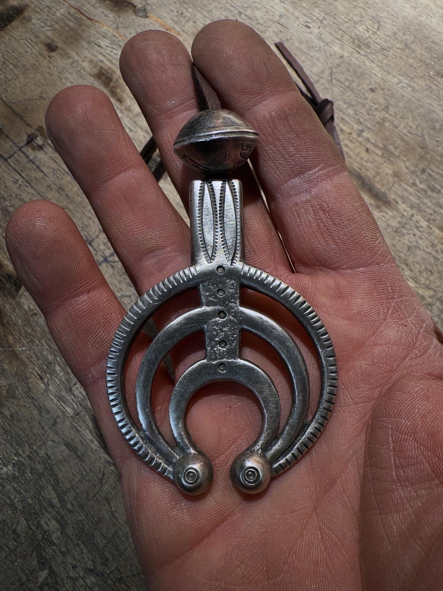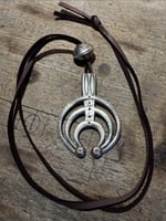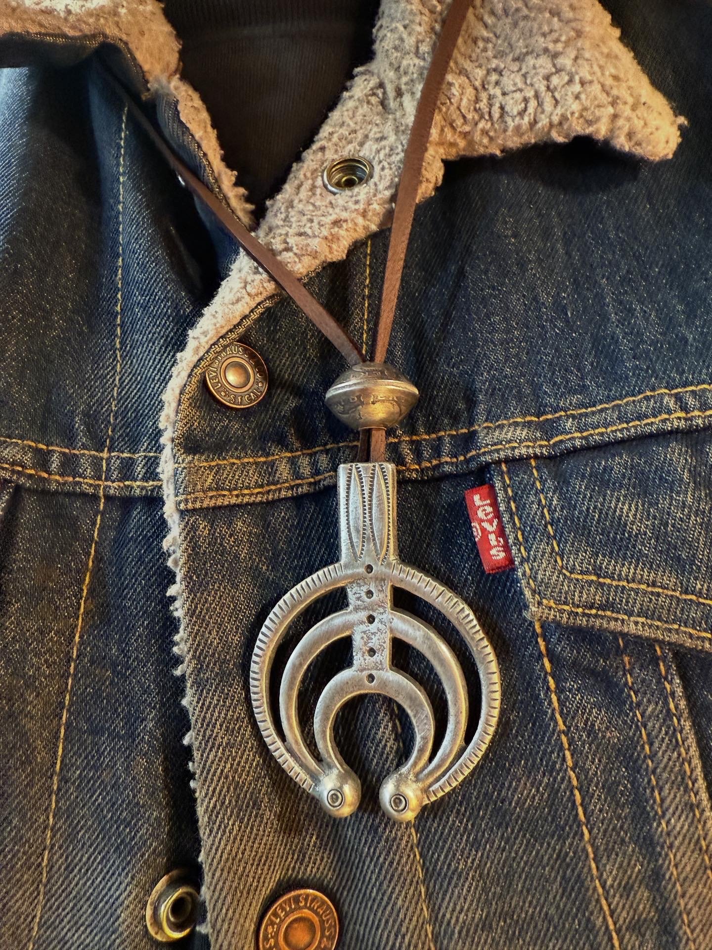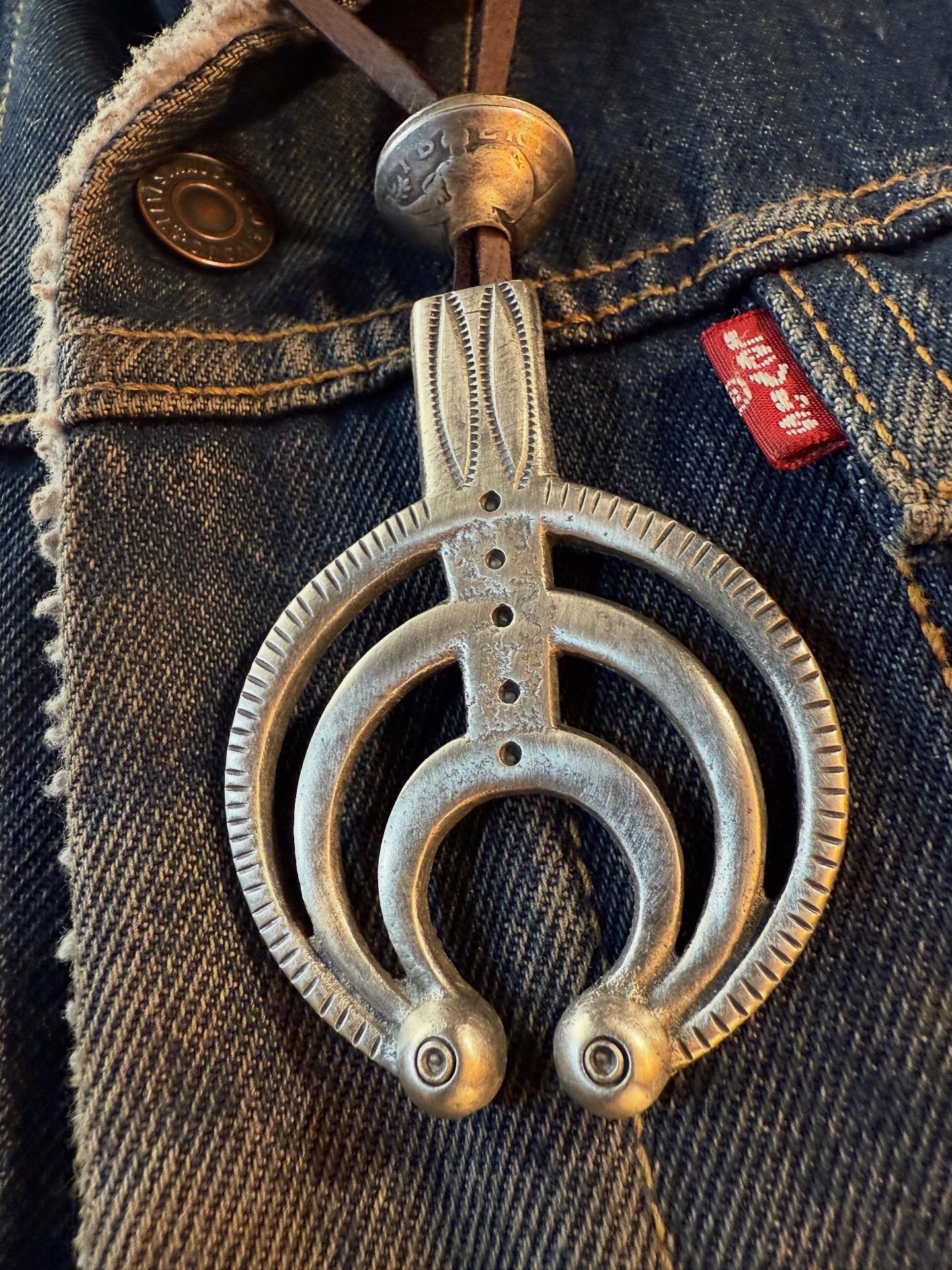 Tufa cast & handmade entirely with forged repurposed 1890s .925 Sterling Silver pour. Tooled, cold chisel, shaped, filed & stamped the old way. 26” brown deer leather cord with a Walking Liberty Silver Pearl