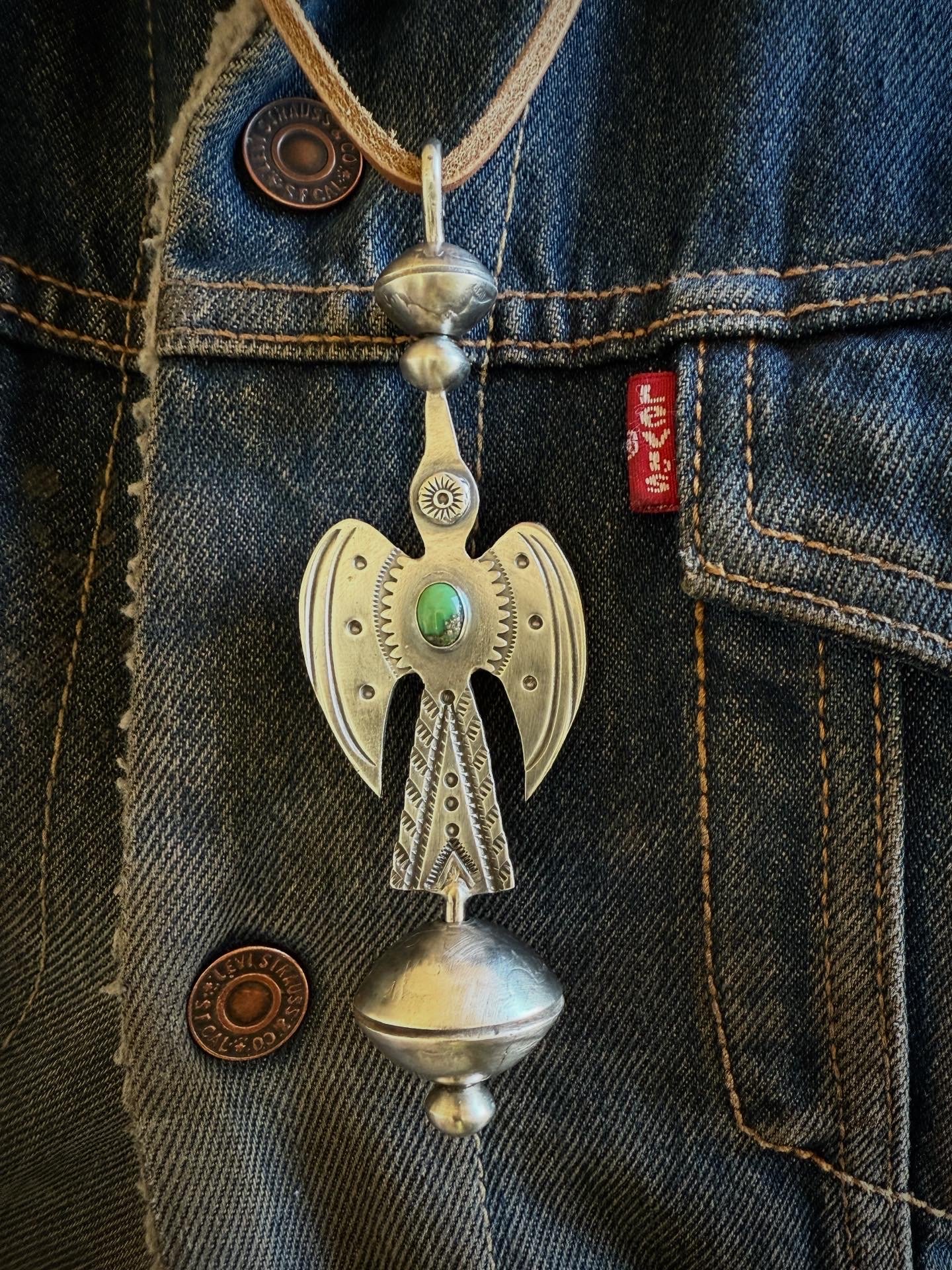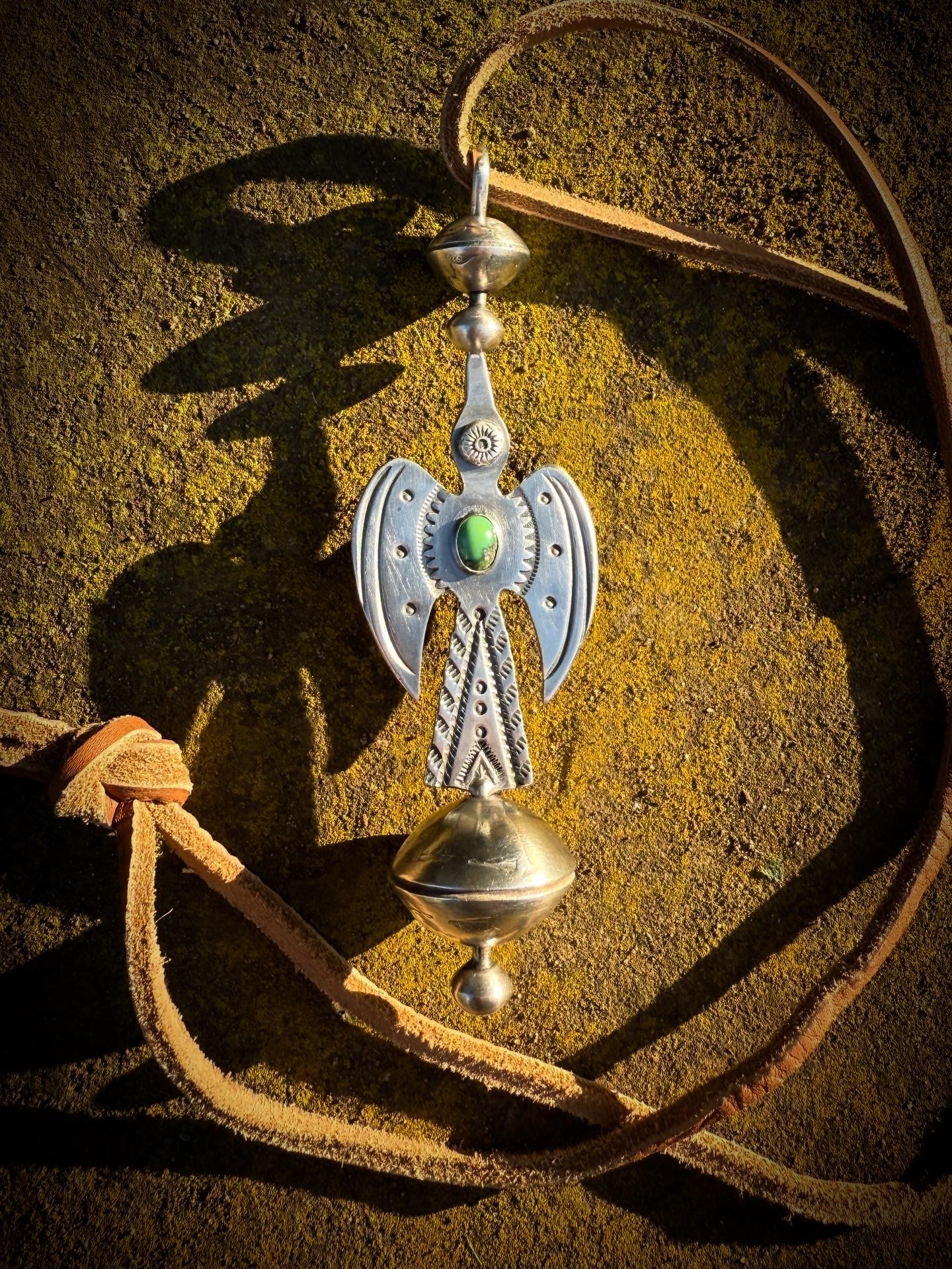 Handmade Ingot (.925 Sterling) Royston Medicine Bird Pendant, hand wrought, tooled & stamped. The Sterling Silver Bezel is adorned with rotating Mercury Silver Dime Pearl + Sterling 9mm pearl and bottom of bird is adorned with a rotating Walking Liberty Silver Half Dollar Pearl + Sterling 9mm pearl. Strung on 26" adjustable deer leather. Old Style classic and built to last generations.